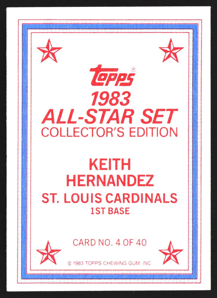 The Card pictured is the card you will receive unless there are multiple quantities then you will receive a card in the comparable grade. Cards in poor condition could have creasing, stains, rounded corners, pen marks or a combo of them. please see pics for a better understanding of cards condition. Very Good St. Louis Cardinals 1983 All-Star Set Collector's Edition (Glossy Send-Ins) Keith Hernandez #4 1983 Topps Topps 1983 Baseball .