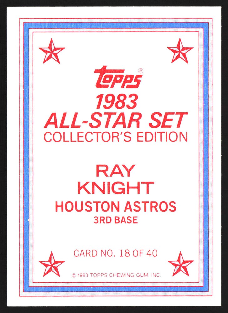 The Card pictured is the card you will receive unless there are multiple quantities then you will receive a card in the comparable grade. Cards in poor condition could have creasing, stains, rounded corners, pen marks or a combo of them. please see pics for a better understanding of cards condition. Very Good Houston Astros 1983 All-Star Set Collector's Edition (Glossy Send-Ins) Ray Knight #18 1983 Topps Topps 1983 Baseball .