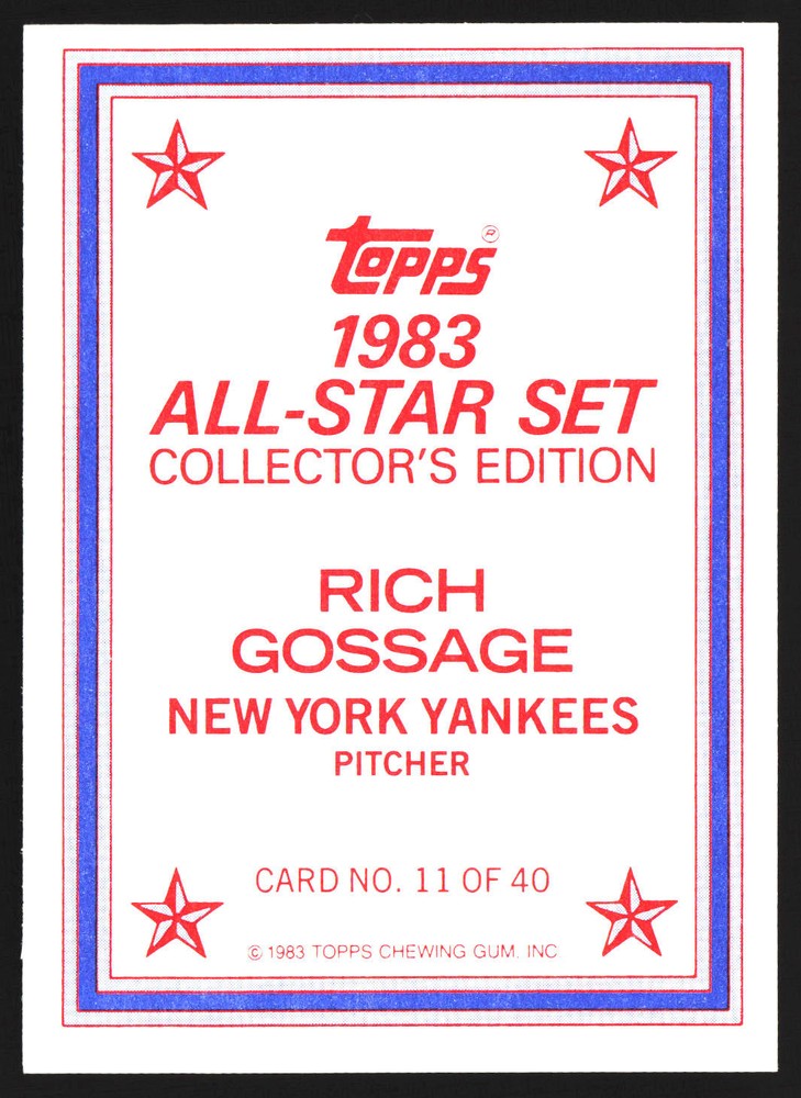 The Card pictured is the card you will receive unless there are multiple quantities then you will receive a card in the comparable grade. Cards in poor condition could have creasing, stains, rounded corners, pen marks or a combo of them. please see pics for a better understanding of cards condition. Very Good New York Yankees 1983 All-Star Set Collector's Edition (Glossy Send-Ins) Rich Gossage #11 1983 Topps Topps 1983 Baseball .