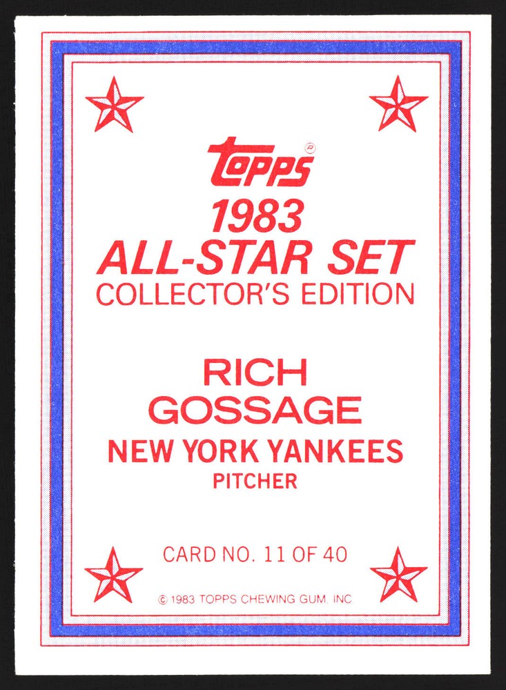 The Card pictured is the card you will receive unless there are multiple quantities then you will receive a card in the comparable grade. Cards in poor condition could have creasing, stains, rounded corners, pen marks or a combo of them. please see pics for a better understanding of cards condition. Very Good New York Yankees 1983 All-Star Set Collector's Edition (Glossy Send-Ins) Rich Gossage #11 1983 Topps Topps 1983 Baseball .