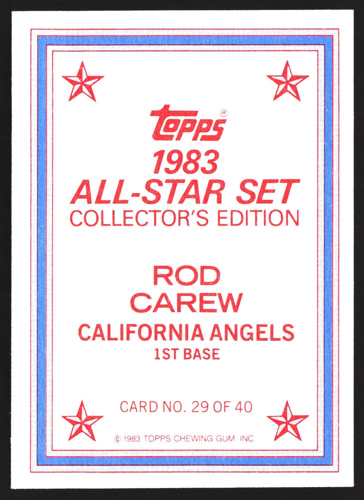 The Card pictured is the card you will receive unless there are multiple quantities then you will receive a card in the comparable grade. Cards in poor condition could have creasing, stains, rounded corners, pen marks or a combo of them. please see pics for a better understanding of cards condition. Very Good California Angels 1983 All-Star Set Collector's Edition (Glossy Send-Ins) Rod Carew #29 1983 Topps Topps 1983 Baseball .