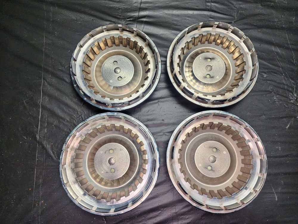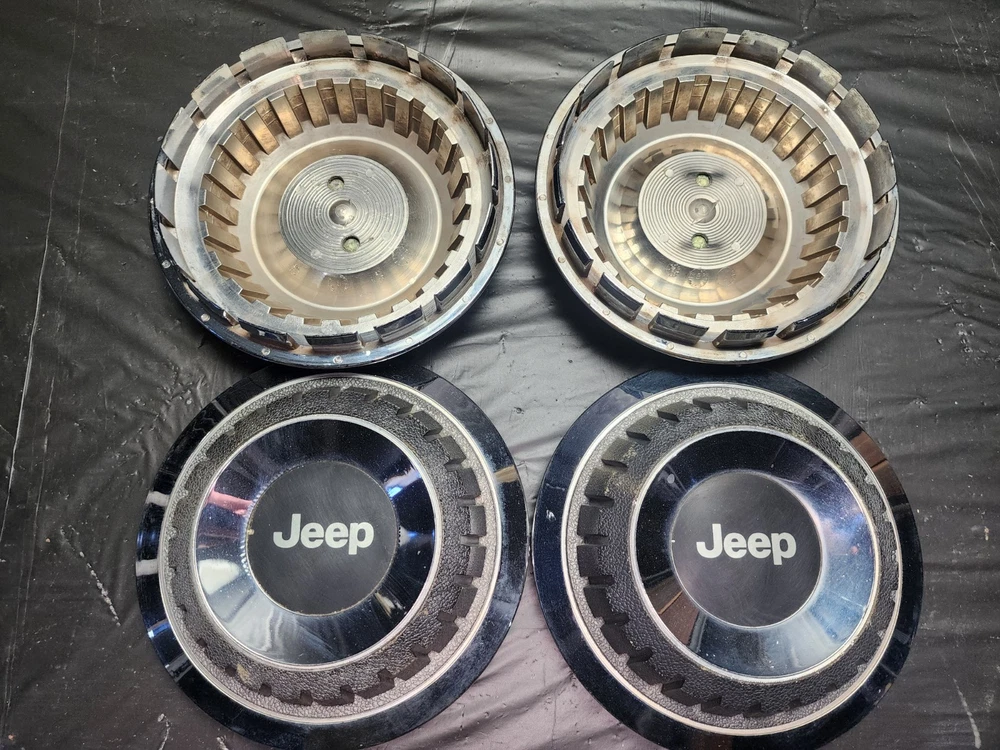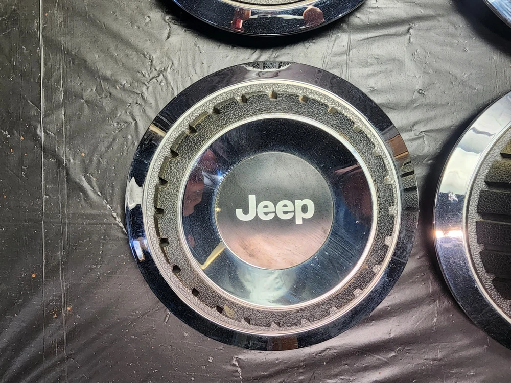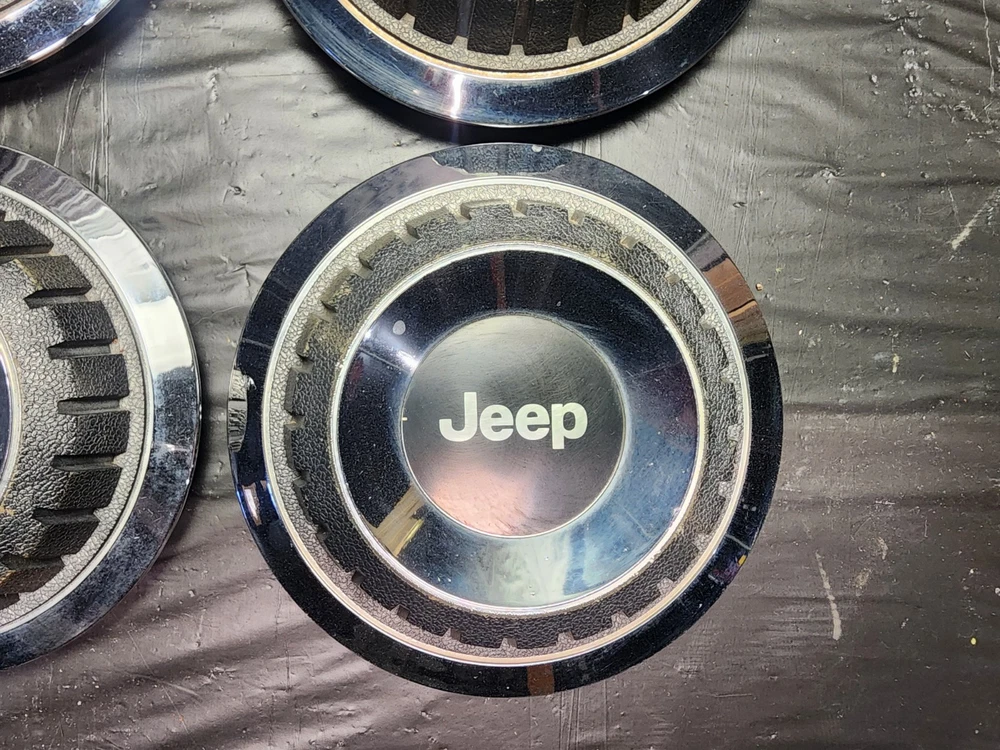 Vintage 40s 50s 60s 70s hub caps. 1984-1991 jeep set of 4 Original OEM Factory OE hubcaps wheel covers center caps. in good condition considering their age and being used. These are Used hubcaps off of old classic cars that were driven on the road and used, so please see photos for complete condition as they are not all perfect. Most have some fading, dings, scuffing, mineral staining, etc could use a good polishing to bring em back to full shine, but otherwise in beautiful condition. Check out more of my ebay page as we are going through and listing a ton of classic / vintage hubcaps from the the 20's 30's 40's 50's 60's 70's 80's 90's 00's and up. all different makes and models such as Ford Chevy Chevrolet GM Cadillac GMC camero nova Chevelle Nomad Bel Air Mercury Corvette Mustang Oldsmobile Pontiac Lincoln Dodge Plymouth Buick Chrysler Mopar Fairlane Volkswagen Cheiftain Challanger Charger 1500 4x4 muscle car hot rod rat rod Cars and Trucks 15in 14in 16in and so much more from full sets to sets of 2 and singles, you name it check us out!