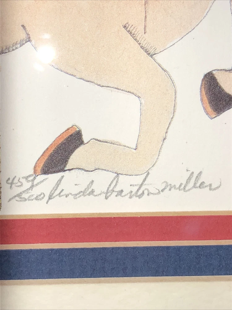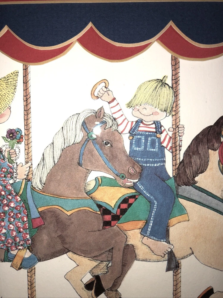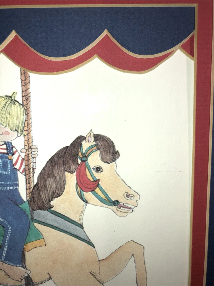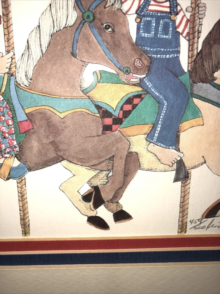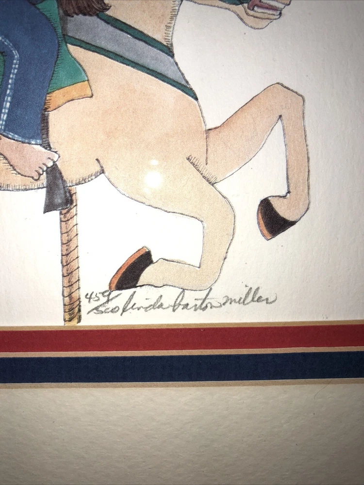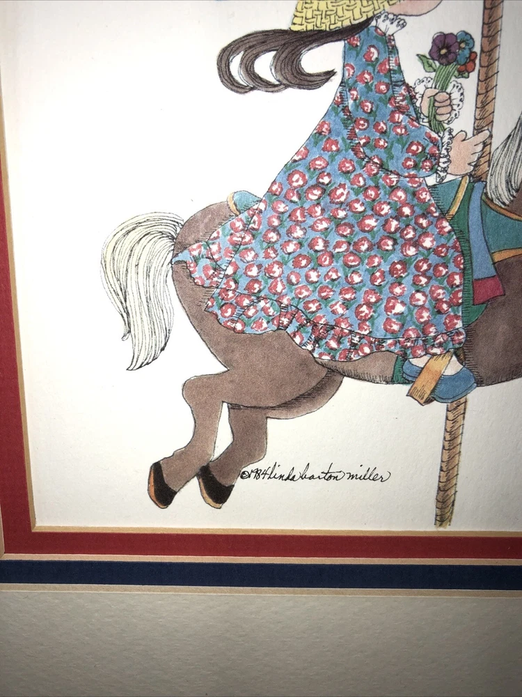 1984 Linda Barton Miller limited edition pen and watercolor lithograph print of “Children on the Carrousel” (or “Grabbing the Brass Ring”—your choice). Signed and autographed in pencil. Issue 459/500. Preowned. Custom matted and metal frame. Custom matting enhances the image experience. Some nicks and superficial scratches are visible on the frame surface. Otherwise very well preserved. No fading or foxing. While not rare, this print is difficult to find on various reseller platforms. The last one reported sold was in May 2016 (159/500), unframed and un-matted. Highly collectible children’s prints. Print image area measures 9”W X 6”T. Frame measurements can be found in the description above. Framed print weighs 2 lbs 5.4 ounces.