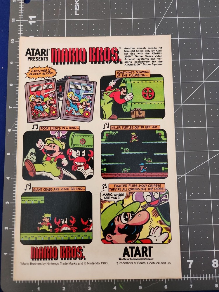 Own a piece of gaming history with this 1984 Mario Bros. Atari video game print ad. The colorful ad features iconic characters from the popular game and is in comic size, making it a unique addition to any gaming or advertising collection. The ad is authentic and perfect for fans of vintage video games or advertising memorabilia. This Ad will be stored and shipped inside an acid-free plastic sleeve with a backing board