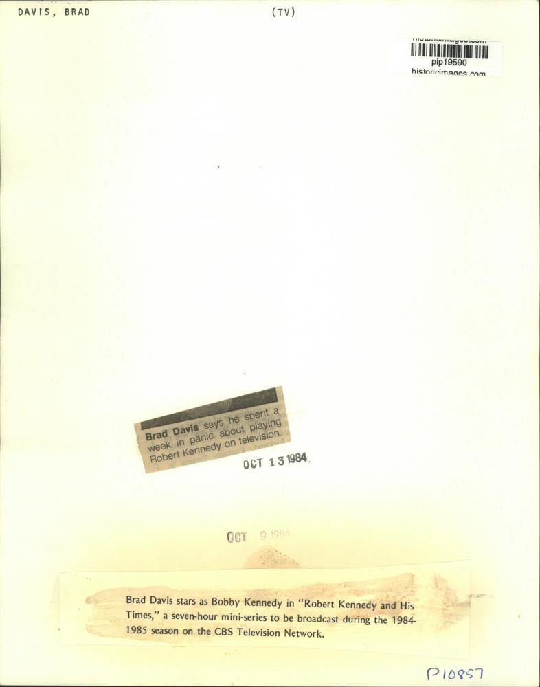 ebay template Note: Please study the images carefully to determine the condition of this vintage photograph, as it may not be in perfect condition. It may contain wrinkles, cracks, and possibly even tears due to its age and how it was handled before it got to us. A scanner may interpret colors and contrast differently than human eyes will, so it is possible that the actual photograph may be slightly darker or lighter in person. This vintage photograph is offered for sale as a collectible item and conveys no transfer of copyright. 1984 Press Photo Brad Davis in "Robert Kennedy and His Times," on CBS. This is an original press photo. TV - Brad Davis stars as Bobby Kennedy in "Robert Kennedy and His Times," a seven-hour mini-series to be broadcast during the 1984- 1985 season on the CBS Television Network. Brad Davis says he spent about a week in panic about playing Robert Kennedy on television.Photo measures 8 x 10.25inches. Photo is dated 10-13-1984. PHOTO FRONT PHOTO BACK Historic Images Part Number: pip19590 Sell Smarter with Kyozou. Inventory and Ecommerce Management
