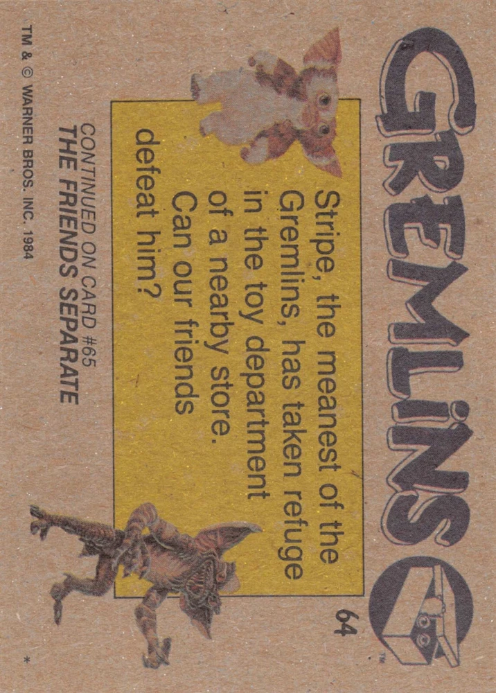 This listing is for your choice of any available 1984 Topps Gremlins card, sticker or wrapper from the drop-down menu above. Photos show front and backside of each card, be sure to scroll sideways to view front and backside photos! Any questions? Please ask before buying. International "USPS First Class Mail" will not include a tracking number for this item, if you would like a tracking number please choose the "eBay International Standard Shipping" option when you check out. As with all of my "pick-a-card" listings, I will be shipping with "eBay Standard Envelope". The rules of this envelope state that it cannot be too thick, so please expect your order to be packaged as follows: 1 to 6 cards will be slid into a single sleeve, the sleeve will then be slid inside of a semi-rigid Card-Saver. 7 to 12 cards will be slid into a double sleeve, 13 to 18 cards into a triple sleeve, 19 to 24 cards into a quadruple sleeve(up to six cards per sleeve). The double, triple and quadruple sleeve shipping will not have the Card-Saver. If you buy more than 1 card and want it packaged with more than 1 Card-Saver(or 1 sleeve per card), I kindly ask that you contact me before purchasing to be sure that this is possible to have it done with the stated shipping charge, or if additional shipping would be required. If you do not contact me, then you can expect to receive your order packaged as I have explained here. Please do not expect rigid top-loaders to be included, I don't normally keep a lot of them in stock, but if you message me prior to ordering I will be able to see if I have any that can be included with your order - additional shipping may be required. In order to get free combined shipping from this and any of my other "pick-a-card" listings, you must add all of your cards to the cart and check out when you are done shopping. If you do not use the cart you will be overpaying on shipping and I cannot refund you on over-payed shipping. So please use the cart and get your FREE COMBINED SHIPPING!