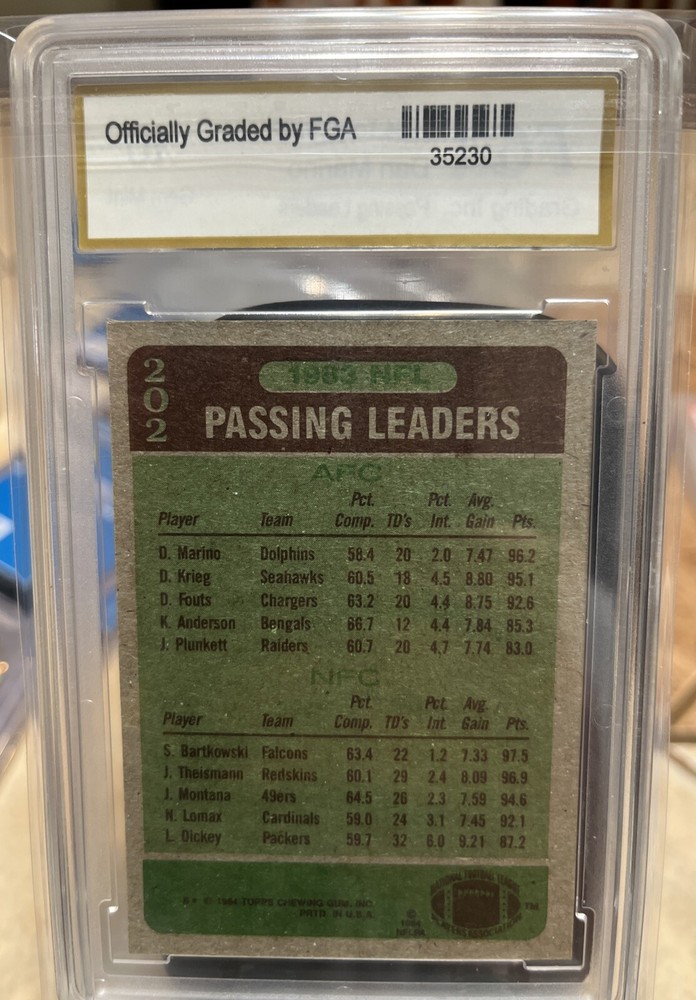 The product is a 1984 Topps trading card featuring NFL passing leaders Dan Marino and Steve Bartkowski. This card is part of the base set and is a rookie card for Dan Marino. It has a card number of 202 and is in gem mint condition with a grade of FGA 10. The card is from the National Football League (NFL) and manufactured by Topps.