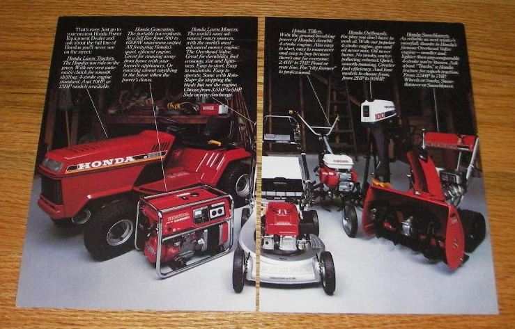 Item ID: multi103 This listing is for a vintage paper advertisement. This is a 1985 4-page ad (2 pages, front/back) for Honda Power equipment, featuring Lawn Tractors, Generators, Lawn Mowers, Tillers, Outboards and Snowblowers. The size of each page is approximately 6.5x10 inches. The caption for this ad is "How to fit six Hondas in a two-car garage" The ad is in good overall condition, with some light wear. This vintage ad would look great framed and displayed! Add it to your collection today!