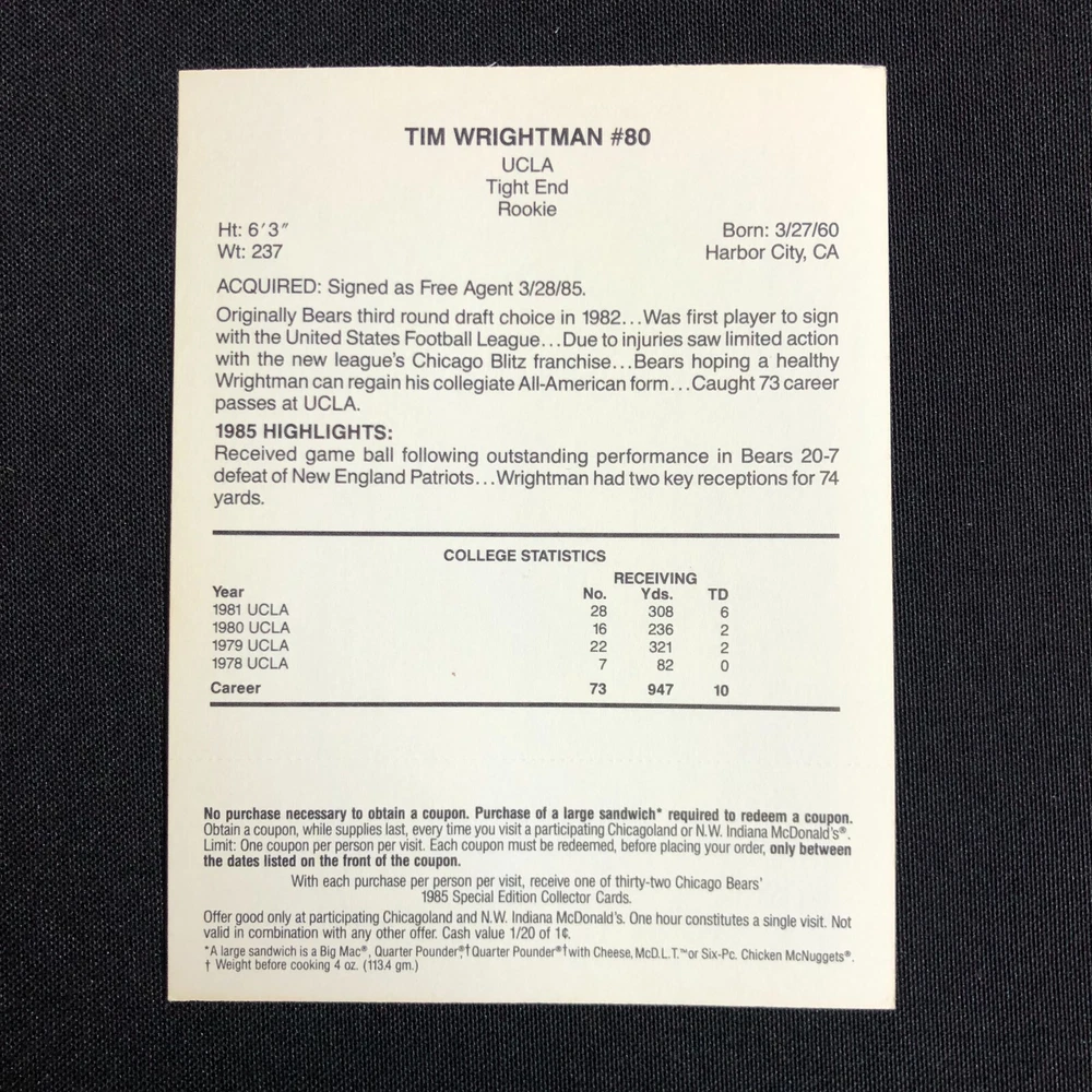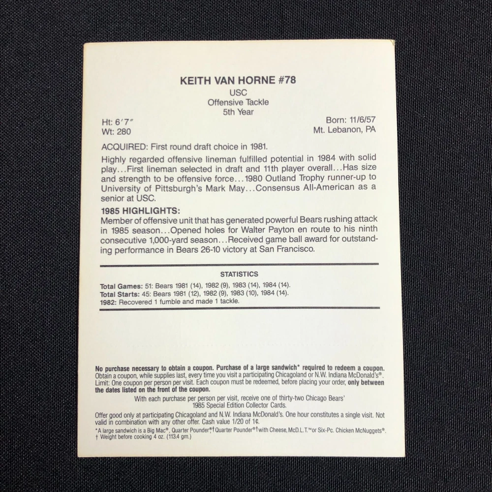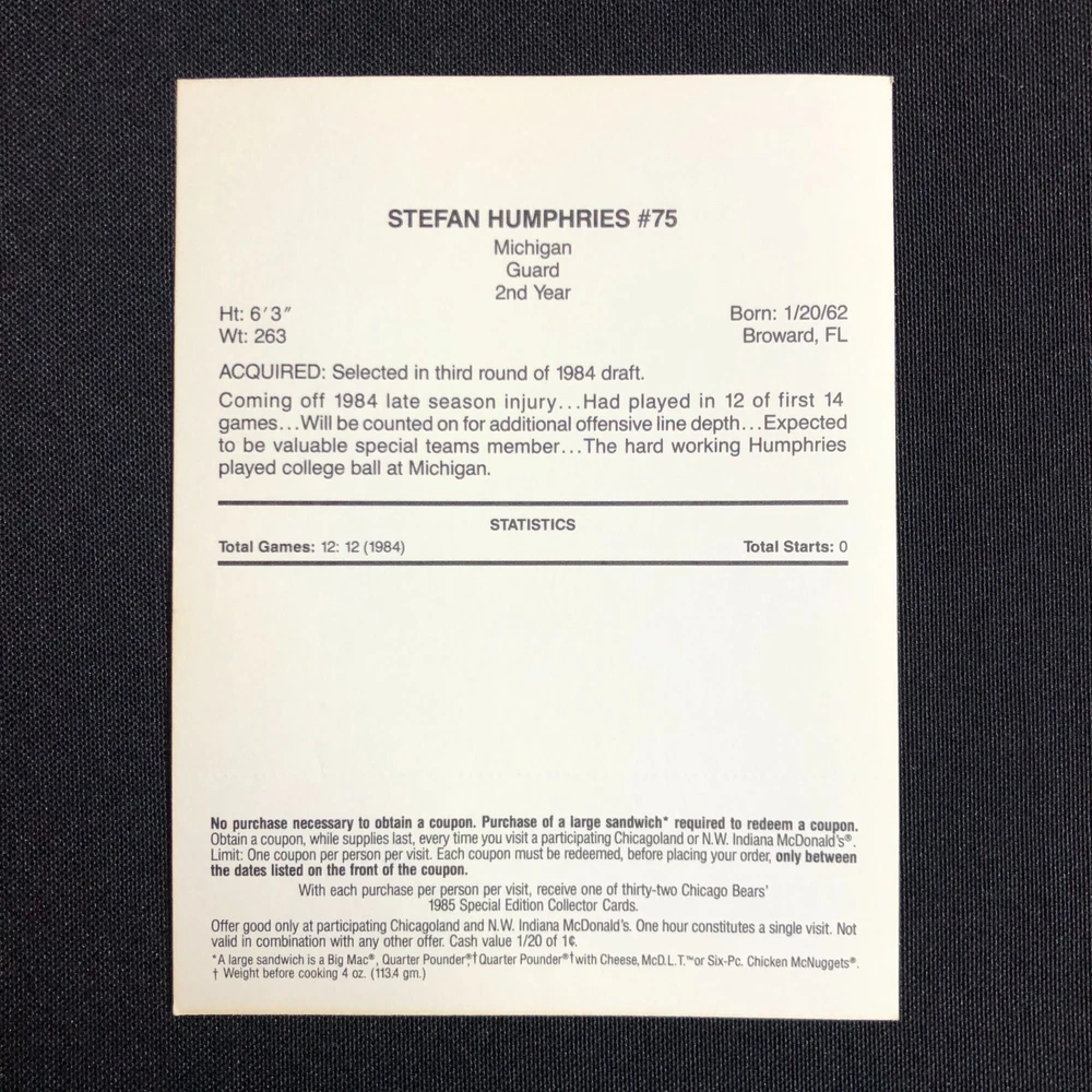 Number of Cards: 5 Year Manufactured: 1985 Seller Notes: “FN-VF with coupons still intact.” Card Size: Oversized Set: 1985 McDonald's Chicago Bears Original/Licensed Reprint: Original Season: 1985-86 Sport: Bowls Player/Athlete: Steve McMichael, William Perry, Tim Wrightman, Keith Van Horne, Stefan Humphries Features: 1st Edition, Limited Edition Country/Region of Manufacture: United States Team: Chicago Bears League: National Football League (NFL) Manufacturer: Mcdonalds Type: Sports Trading Card Event/Tournament: Super Bowl Card Name: 1985 McDonalds Chicago Bears Vintage: Yes Autographed: No