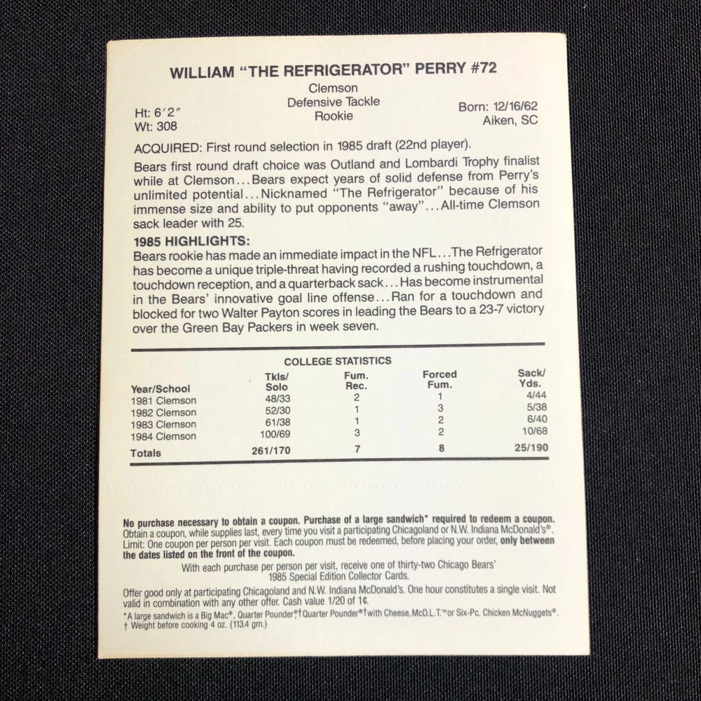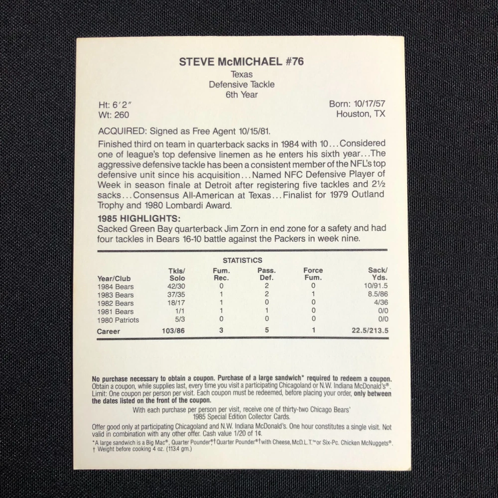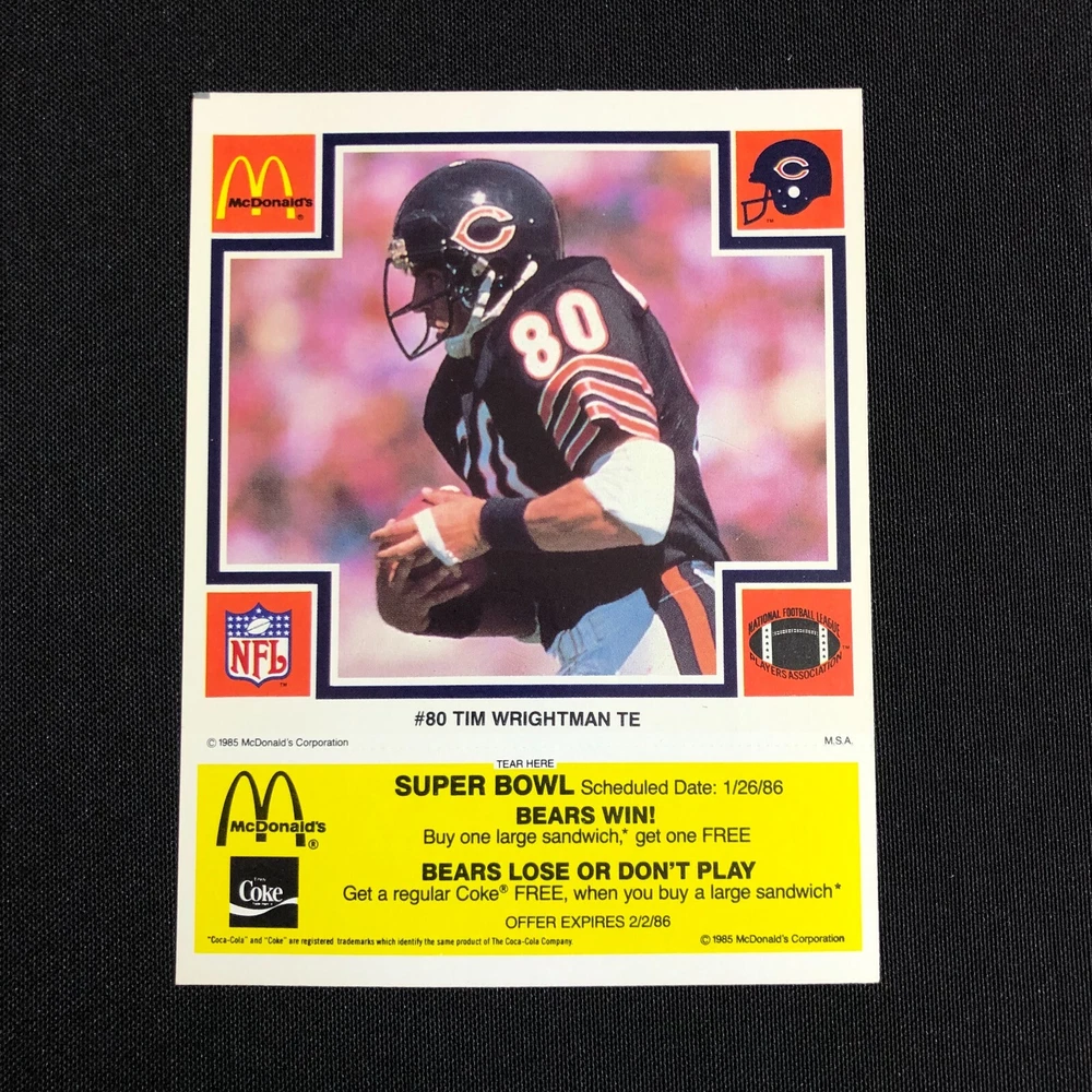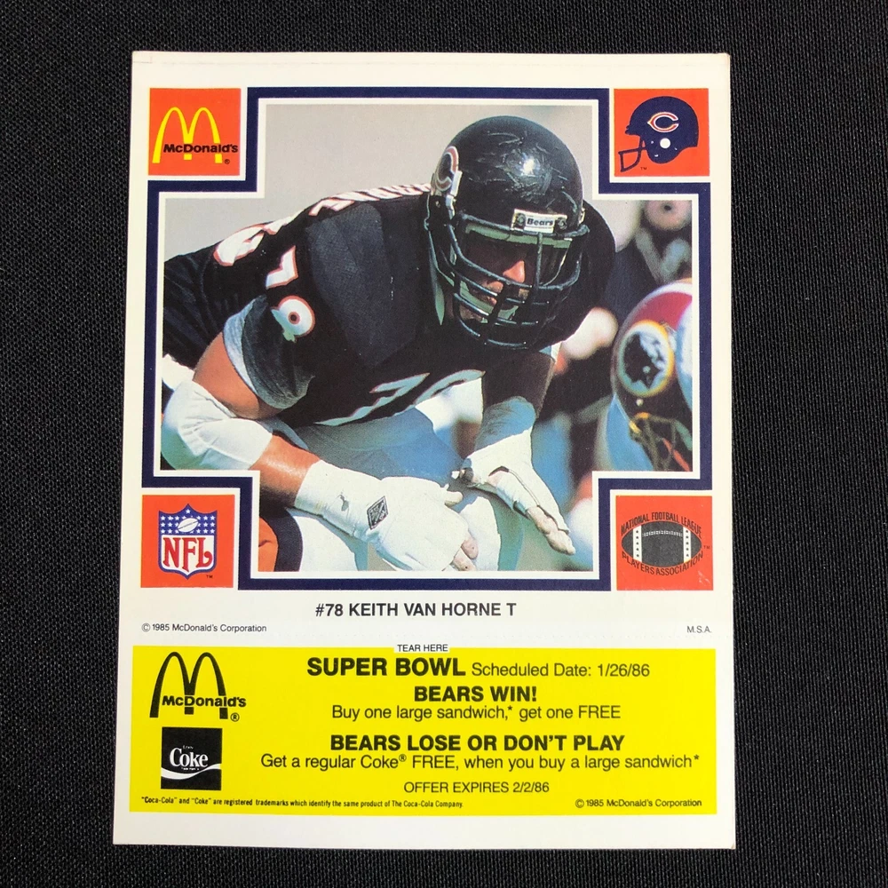 1985 Chicago Bears McDonalds Super Bowl Vintage Coupon Trading Cards Lot of 5