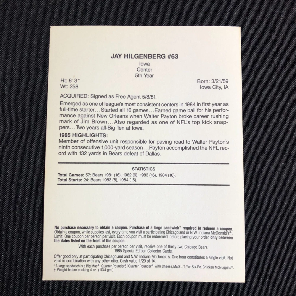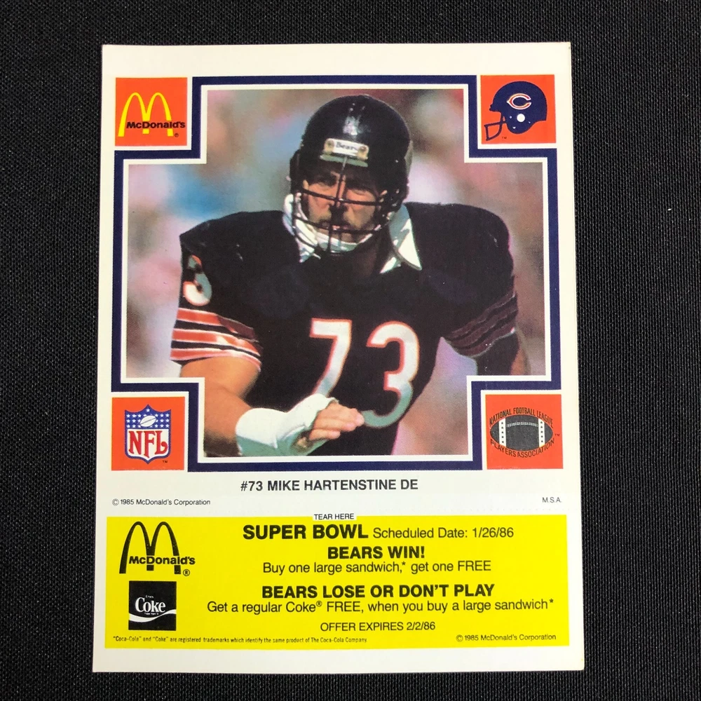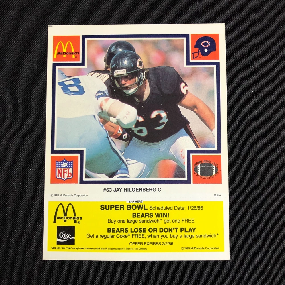 Team: Chicago Bears Original/Licensed Reprint: Original Number of Cards: 5 Year Manufactured: 1985 Autographed: No Country/Region of Manufacture: United States Season: 1985-86 Vintage: Yes Type: Sports Trading Card Card Name: 1985 McDonalds Chicago Bears Sport: Bowls Event/Tournament: Super Bowl Player/Athlete: Jay Hilgenberg, Walter Payton, Dennis McKinnon, Jom Covert, Mike Hartenstine Card Size: Oversized Seller Notes: “FN-VF with coupons still intact.” Manufacturer: Mcdonalds League: National Football League (NFL) Set: 1985 McDonald's Chicago Bears Features: 1st Edition, Limited Edition