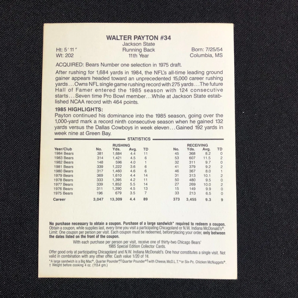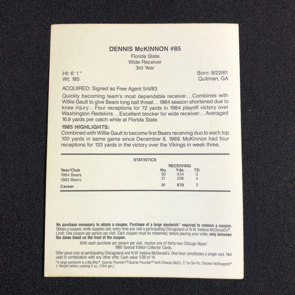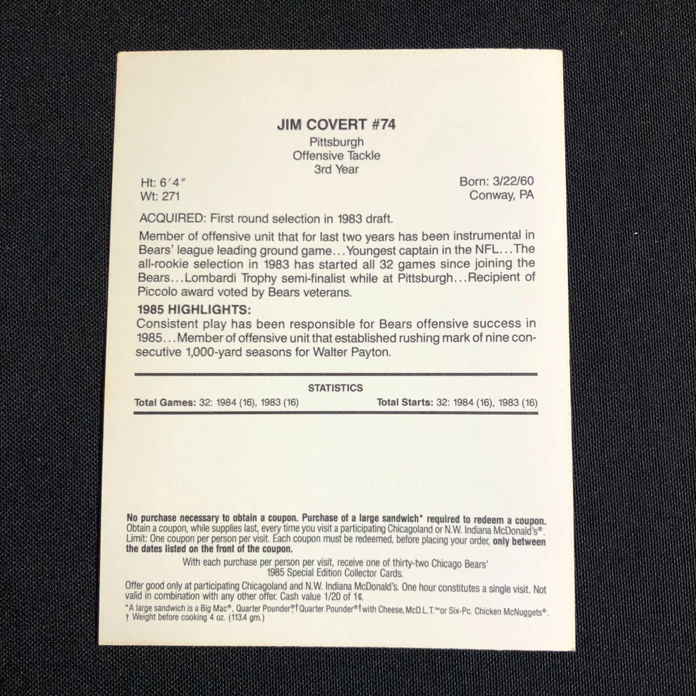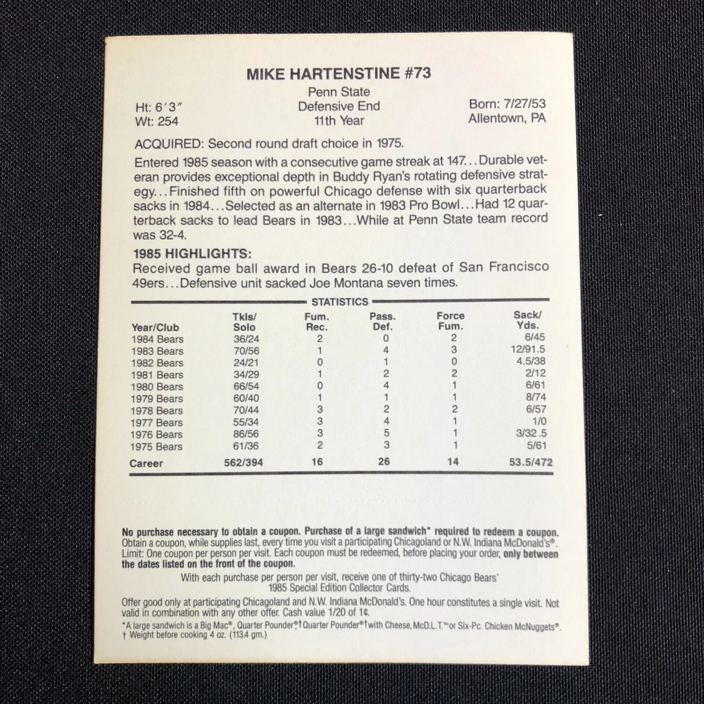 Team: Chicago Bears Original/Licensed Reprint: Original Number of Cards: 5 Year Manufactured: 1985 Autographed: No Country/Region of Manufacture: United States Season: 1985-86 Vintage: Yes Type: Sports Trading Card Card Name: 1985 McDonalds Chicago Bears Sport: Bowls Event/Tournament: Super Bowl Player/Athlete: Jay Hilgenberg, Walter Payton, Dennis McKinnon, Jom Covert, Mike Hartenstine Card Size: Oversized Seller Notes: “FN-VF with coupons still intact.” Manufacturer: Mcdonalds League: National Football League (NFL) Set: 1985 McDonald's Chicago Bears Features: 1st Edition, Limited Edition
