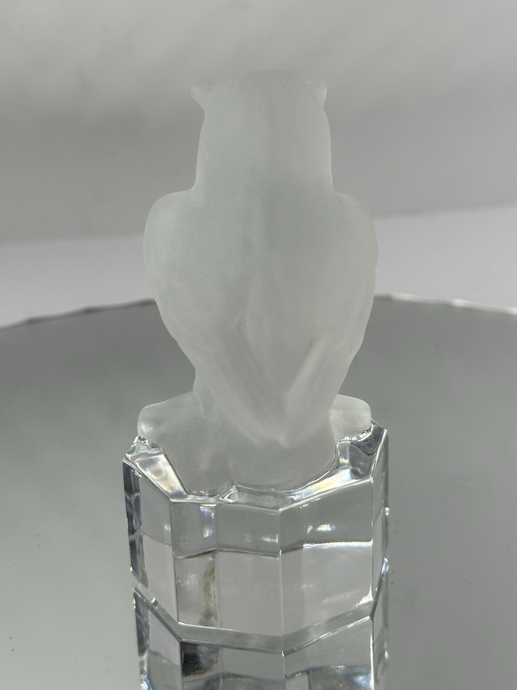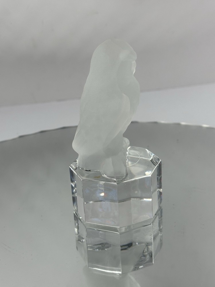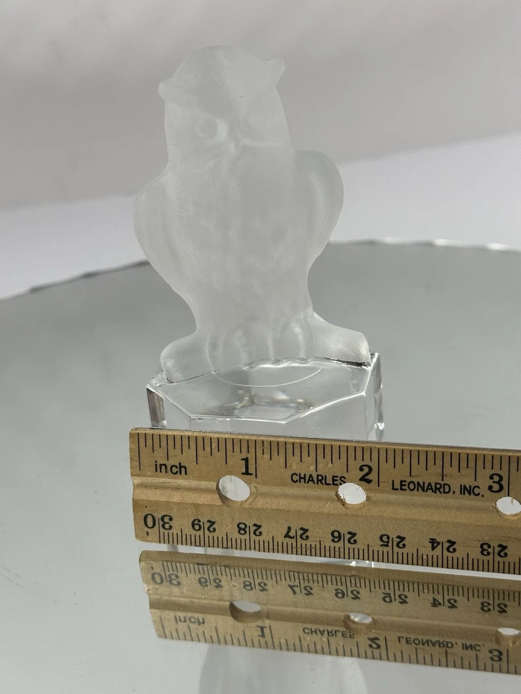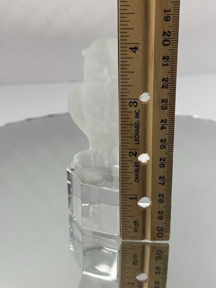 The Goebel 1985 Frosted Glass Owl on Clear Base is a vintage figurine crafted in Germany in the late 20th century. This handmade owl paperweight features a decorative 3D effect with etched patterns on the glass, giving it a glossy finish. Measuring 2.25 inches in length, 3 inches in height, and 0.5 inches in width, this owl figurine is a unique and charming addition to any collection, showcasing intricate details and a whimsical owl theme by the brand Goebel.