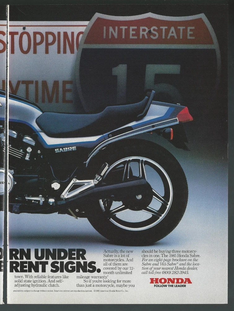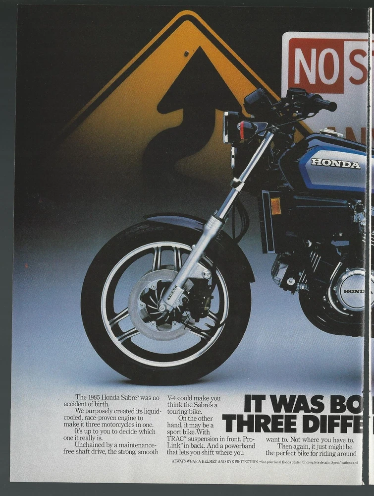 Selling is a 2-page advertisement for: HONDA SABRE motorcycle from 1985 This advertising page was the American Honda Motor Co. Inc. The 2-page ad has a large photo of a Honda Sabre motorcycle. There are a few road signs in the background. Ad text starts “It was born under three different signs” and goes on about the bike. This ad is 2 full pages, each approx. 8” x 11”, carefully removed from an actual 1985 magazine. my ad#R&T522 Please note the flat-rate shipping for my advertising pages. These will be mailed flat (with cardstock stiffeners) in one envelope. If you are buying more than 1 ad (or multiple ad lot), do not pay until you have finished shopping. eBay should combine sales automatically. If they do not, please do not pay until I send the combined invoice. Click Here To Visit My eBay Store: busybeas books and ads 7000+ advertisement pages and magazine articles non-fiction books craft & hobby items plus anything I find that looks interesting! Please see my store for more goodies, books and magazines. I'll combine wins to save on postage. Thanks For Looking! Luke 12: 15 Note to CANADIAN purchasers: eBay is automatically charging you PST/GST/HST . I do NOT collect it or remit it, eBay does. Note to UNITED STATES purchasers (and some other international spots too) : eBay is automatically charging you the sales tax (for some USA states) or VAT (for some countries). I do NOT collect it or remit it, eBay does.