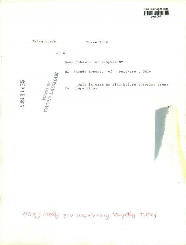 ebay template Note: Please study the images carefully to determine the condition of this vintage photograph, as it may not be in perfect condition. It may contain wrinkles, cracks, and possibly even tears due to its age and how it was handled before it got to us. A scanner may interpret colors and contrast differently than human eyes will, so it is possible that the actual photograph may be slightly darker or lighter in person. This vintage photograph is offered for sale as a collectible item and conveys no transfer of copyright. 1985 Press Photo Contestants in horse show competition at Fairgrounds, New York This is an original press photo. Fairgrounds - Horse Show -- Left to right - Dawn Johnson of Memphis, NY; Rhonda Sweeney of Delaware, Ohio wait in warm up ring before entering arena for competition. Encore Appaloosa Association and Agway Classic. (New York)Photo measures 8.5 x 11.25inches. Photo is dated 09-15-1985. PHOTO FRONT PHOTO BACK Historic Images Part Number: sya60611 FAQs Q: Can I just download a digital version instead? A: No, we sell only vintage originals and do not make or distribute any copies, including digital ones. Q: Do you combine shipping and invoices? A: Multiple photos won on the same seller ID combine automatically through the eBay checkout process. If you encounter problems with this, send us a message via eBay messaging and we will send you an invoice. Due to eBay limitations, we cannot combine items won on our different seller IDs for a single shipping charge. Q: How quickly do you ship the items once paid? A: We ship within one business day after your payment clears. If you do not receive an "order shipped" email from us by the close of the second business day from submitting payment, please e-mail us via eBay messaging. Q: How do you make sure my photograph arrives safely? A: We package each order between two cross-corrugated pieces of cardboard to ensure that the package is as difficult to bend as possible. We then wrap each order in a plastic sheet to help protect against moisture. We want you to rest assured that we take every precaution to ensure that the photograph you receive will be in the same condition in your care as it was in ours. Q: Will the "Historic Images" watermark be on my photo when I receive it? A: No. This is a digital watermark we use to protect our images. It is not printed on the photo. Q: What are your office hours? A: eBay for us is a business, and a very fun one to be in! We are open M-F 9 to 5 (CST). Therefore, we do not return e-mails and phone calls over the weekend. We observe the following holidays: New Years Day, Memorial Day, Fourth of July, Labor Day, Thanksgiving and the day after Thanksgiving, Christmas Eve and Christmas Day. Q: Where did all these vintage photos come from? A: These original vintage photographs are from various news service and newspaper photo archives from locations around the country including: Boston, Detroit, Tampa, Chicago, Denver, Seattle, New Orleans, Milwaukee, Portland, Spokane, and more. We do not copy or reproduce any photographs -- every item is a unique vintage piece that was housed in a news archive. Q: Can I use this photograph in my book/blog/website? A: The short answer is no. There is no transfer of copyright for republication or reproduction with these photographs when you purchase them, and only photographs taken before 1923 are currently automatically in the public domain. Permission from the copyright holder, which usually can be identified from the back of each photo, must be sought to republish or reproduce the image for any purpose. Q: Do you relist items (in case I miss an auction ending)? A: Auction items that receive no bids are relisted in our store (historicimages-store on eBay) as a fixed-price item and at a higher price than the starting auction price. Q: Do you leave feedback? A: Yes, we always leave feedback for buyers. Our software monitors when our buyers leave us feedback, then notifies us that we can leave feedback for the buyer. Rest assured, if you leave feedback, we will do the same! Check out our family of eBay IDs: historicimages01 Sports Photos historicimages02 Entertainment Photos historicimages03 Americana Photos historicimages04 International & War Photos historicimages05 Transportation Photos historicimages06 Photos of All Subjects historicimages07 Entertainment Photos historicimages08 Newsworthy Photos historicimages09 Entertainment Photos historicimages10 Sports Photos historicimages-store Our largest fixed-price selection historicimages-gallery Hand-picked photos Saturday night auctions About Us Historic Images was formed in September 2009, with a handful of scanners working out of a basement to digitize newspaper photo archives. We have since moved out of the basement, and we can now archive thousands of photos per day. Our company has worked with magazines and newspapers from Detroit, Boston, Denver, Seattle, Tampa, Chicago, and New Orleans, just to name a few. We are constantly adding to our inventory, and have assembled an archive of millions of photos to date. As our company evolved, we began our eBay business, which brings thousands of fresh auctions per week to the world's largest online auction marketplace. Our custom software systems and team of great employees allow us to efficiently scan and sell large photo archives online. At the very core of our company's DNA is a strong commitment to customer satisfaction and strict integrity for our product. Our promise to you is that we will do everything in our power to provide you a great buying experience. Copyright 2009 - Present, Historic Images, Inc. Sell Smarter with Kyozou. Inventory and Ecommerce Management