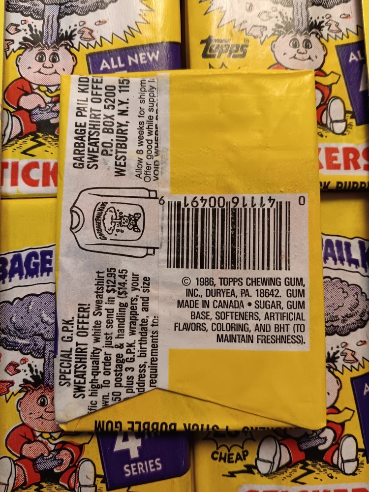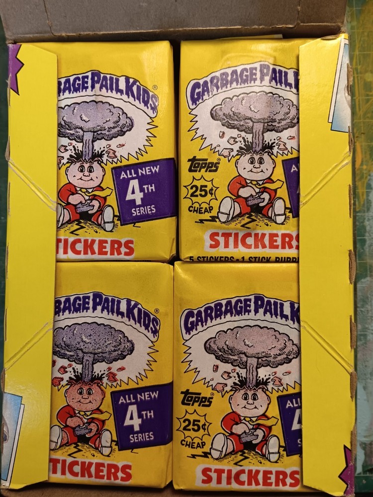Number of Packs:48Manufacturer:ToppsNumber of Cards:240Franchise:Garbage Pail KidsConfiguration:PackYear Manufactured:1986Character:BoxVintage:YesCountry/Region of Manufacture:United StatesLanguage:EnglishType:Non-Sport Trading CardSet:Garbage Pail Kids - Series 4