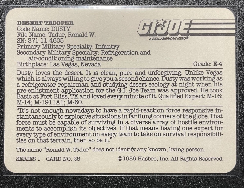 This G.I. Joe trading card is a must-have for collectors—Dusty looks sharp, and the condition is exactly as shown in the photos. The seller is super flexible, offering combined shipping and discounts for multiple buys. Great communication and a huge selection of sports cards too! Highly recommend checking out their other items for more hidden gems.