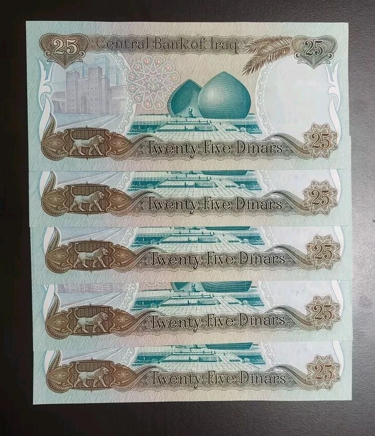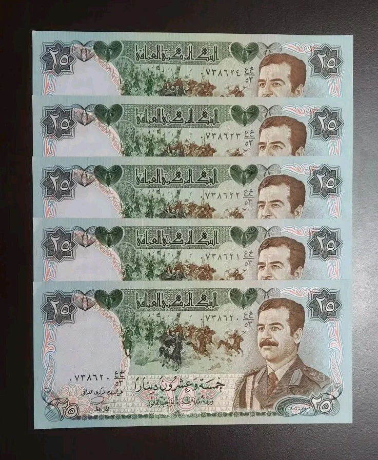 Home1986 Iraq 25 Dinar Iraqi Dinars Saddam Hussein P-73 x 5 AU/UNC Lot Five Notes