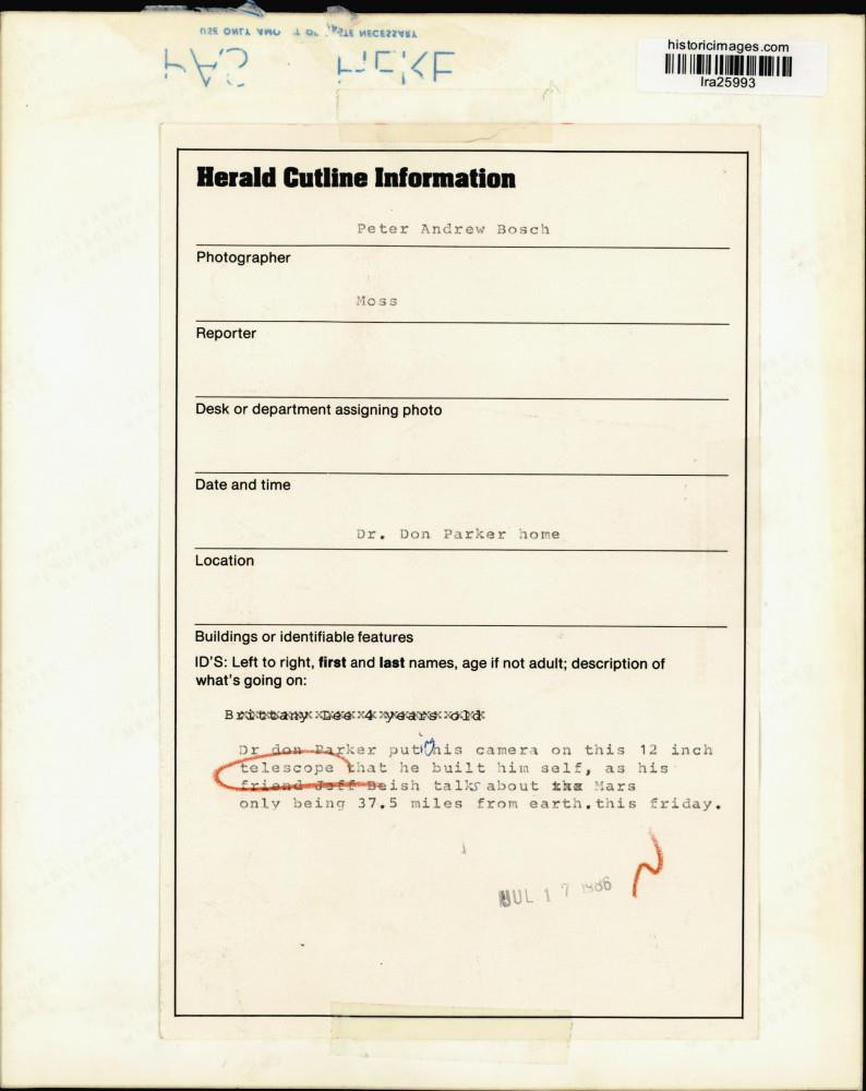 ebay template Note: Please study the images carefully to determine the condition of this vintage photograph, as it may not be in perfect condition. It may contain wrinkles, cracks, and possibly even tears due to its age and how it was handled before it got to us. A scanner may interpret colors and contrast differently than human eyes will, so it is possible that the actual photograph may be slightly darker or lighter in person. This vintage photograph is offered for sale as a collectible item and conveys no transfer of copyright. 1986 Press Photo Dr. Don Parker & Jeff Beish with 12-Inch Telescope - lra25993 This is an original press photo. Dr. Don Parker putting his camera on this 12 inch telescope that he built himself, as his friend Jeff Beish talks about Mars only being 37.5 miles from earth, this Friday.Photo measures 10 x 8inches. Photo is dated 07-17-1986. PHOTO FRONT PHOTO BACK Historic Images Part Number: lra25993 FAQs Q: Can I just download a digital version instead? A: No, we sell only vintage originals and do not make or distribute any copies, including digital ones. Q: Do you combine shipping and invoices? A: Multiple photos won on the same seller ID combine automatically through the eBay checkout process. If you encounter problems with this, send us a message via eBay messaging and we will send you an invoice. Due to eBay limitations, we cannot combine items won on our different seller IDs for a single shipping charge. Q: How quickly do you ship the items once paid? A: We ship within one business day after your payment clears. If you do not receive an "order shipped" email from us by the close of the second business day from submitting payment, please e-mail us via eBay messaging. Q: How do you make sure my photograph arrives safely? A: We package each order between two cross-corrugated pieces of cardboard to ensure that the package is as difficult to bend as possible. We then wrap each order in a plastic sheet to help protect against moisture. We want you to rest assured that we take every precaution to ensure that the photograph you receive will be in the same condition in your care as it was in ours. Q: Will the "Historic Images" watermark be on my photo when I receive it? A: No. This is a digital watermark we use to protect our images. It is not printed on the photo. Q: What are your office hours? A: eBay for us is a business, and a very fun one to be in! We are open M-F 9 to 5 (CST). Therefore, we do not return e-mails and phone calls over the weekend. We observe the following holidays: New Years Day, Memorial Day, Fourth of July, Labor Day, Thanksgiving and the day after Thanksgiving, Christmas Eve and Christmas Day. Q: Where did all these vintage photos come from? A: These original vintage photographs are from various news service and newspaper photo archives from locations around the country including: Boston, Detroit, Tampa, Chicago, Denver, Seattle, New Orleans, Milwaukee, Portland, Spokane, and more. We do not copy or reproduce any photographs -- every item is a unique vintage piece that was housed in a news archive. Q: Can I use this photograph in my book/blog/website? A: The short answer is no. There is no transfer of copyright for republication or reproduction with these photographs when you purchase them, and only photographs taken before 1923 are currently automatically in the public domain. Permission from the copyright holder, which usually can be identified from the back of each photo, must be sought to republish or reproduce the image for any purpose. Q: Do you relist items (in case I miss an auction ending)? A: Auction items that receive no bids are relisted in our store (historicimages-store on eBay) as a fixed-price item and at a higher price than the starting auction price. Q: Do you leave feedback? A: Yes, we always leave feedback for buyers. Our software monitors when our buyers leave us feedback, then notifies us that we can leave feedback for the buyer. Rest assured, if you leave feedback, we will do the same! Check out our family of eBay IDs: historicimages01 Sports Photos historicimages02 Entertainment Photos historicimages03 Americana Photos historicimages04 International & War Photos historicimages05 Transportation Photos historicimages06 Photos of All Subjects historicimages07 Entertainment Photos historicimages08 Newsworthy Photos historicimages09 Entertainment Photos historicimages10 Sports Photos historicimages-store Our largest fixed-price selection historicimages-gallery Hand-picked photos Saturday night auctions About Us Historic Images was formed in September 2009, with a handful of scanners working out of a basement to digitize newspaper photo archives. We have since moved out of the basement, and we can now archive thousands of photos per day. Our company has worked with magazines and newspapers from Detroit, Boston, Denver, Seattle, Tampa, Chicago, and New Orleans, just to name a few. We are constantly adding to our inventory, and have assembled an archive of millions of photos to date. As our company evolved, we began our eBay business, which brings thousands of fresh auctions per week to the world's largest online auction marketplace. Our custom software systems and team of great employees allow us to efficiently scan and sell large photo archives online. At the very core of our company's DNA is a strong commitment to customer satisfaction and strict integrity for our product. Our promise to you is that we will do everything in our power to provide you a great buying experience. Copyright 2009 - Present, Historic Images, Inc. Sell Smarter with Kyozou. Inventory and Ecommerce Management