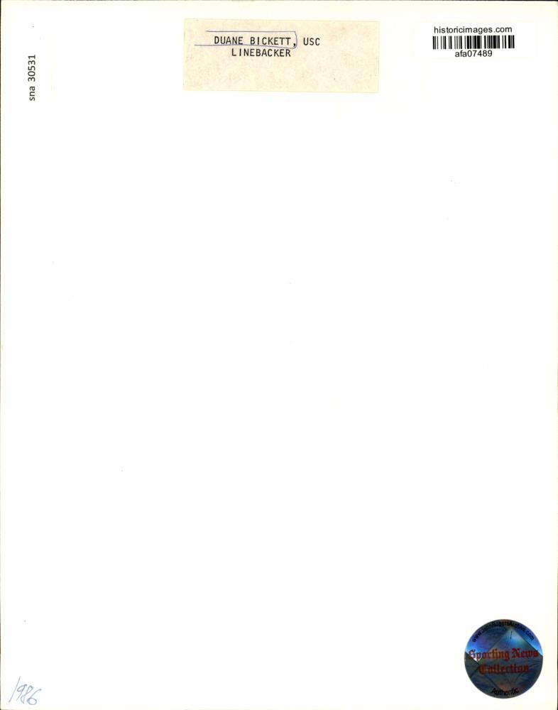 ebay template Note: Please study the images carefully to determine the condition of this vintage photograph, as it may not be in perfect condition. It may contain wrinkles, cracks, and possibly even tears due to its age and how it was handled before it got to us. A scanner may interpret colors and contrast differently than human eyes will, so it is possible that the actual photograph may be slightly darker or lighter in person. This vintage photograph is offered for sale as a collectible item and conveys no transfer of copyright. 1986 Press Photo USC Football Team Linebacker Duane Bickett in Game - afa07489 This is an original press photo. Duane Bickett, USC linebackerPhoto measures 8 x 10inches. Photo is dated --1986. PHOTO FRONT PHOTO BACK Historic Images Part Number: afa07489 FAQs Q: Can I just download a digital version instead? A: No, we sell only vintage originals and do not make or distribute any copies, including digital ones. Q: Do you combine shipping and invoices? A: Multiple photos won on the same seller ID combine automatically through the eBay checkout process. If you encounter problems with this, send us a message via eBay messaging and we will send you an invoice. Due to eBay limitations, we cannot combine items won on our different seller IDs for a single shipping charge. Q: How quickly do you ship the items once paid? A: We ship within one business day after your payment clears. If you do not receive an "order shipped" email from us by the close of the second business day from submitting payment, please e-mail us via eBay messaging. Q: How do you make sure my photograph arrives safely? A: We package each order between two cross-corrugated pieces of cardboard to ensure that the package is as difficult to bend as possible. We then wrap each order in a plastic sheet to help protect against moisture. We want you to rest assured that we take every precaution to ensure that the photograph you receive will be in the same condition in your care as it was in ours. Q: Will the "Historic Images" watermark be on my photo when I receive it? A: No. This is a digital watermark we use to protect our images. It is not printed on the photo. Q: What are your office hours? A: eBay for us is a business, and a very fun one to be in! We are open M-F 9 to 5 (CST). Therefore, we do not return e-mails and phone calls over the weekend. We observe the following holidays: New Years Day, Memorial Day, Fourth of July, Labor Day, Thanksgiving and the day after Thanksgiving, Christmas Eve and Christmas Day. Q: Where did all these vintage photos come from? A: These original vintage photographs are from various news service and newspaper photo archives from locations around the country including: Boston, Detroit, Tampa, Chicago, Denver, Seattle, New Orleans, Milwaukee, Portland, Spokane, and more. We do not copy or reproduce any photographs -- every item is a unique vintage piece that was housed in a news archive. Q: Can I use this photograph in my book/blog/website? A: The short answer is no. There is no transfer of copyright for republication or reproduction with these photographs when you purchase them, and only photographs taken before 1923 are currently automatically in the public domain. Permission from the copyright holder, which usually can be identified from the back of each photo, must be sought to republish or reproduce the image for any purpose. Q: Do you relist items (in case I miss an auction ending)? A: Auction items that receive no bids are relisted in our store (historicimages-store on eBay) as a fixed-price item and at a higher price than the starting auction price. Q: Do you leave feedback? A: Yes, we always leave feedback for buyers. Our software monitors when our buyers leave us feedback, then notifies us that we can leave feedback for the buyer. Rest assured, if you leave feedback, we will do the same! Check out our family of eBay IDs: historicimages01 Sports Photos historicimages02 Entertainment Photos historicimages03 Americana Photos historicimages04 International & War Photos historicimages05 Transportation Photos historicimages06 Photos of All Subjects historicimages07 Entertainment Photos historicimages08 Newsworthy Photos historicimages09 Entertainment Photos historicimages10 Sports Photos historicimages-store Our largest fixed-price selection historicimages-gallery Hand-picked photos Saturday night auctions About Us Historic Images was formed in September 2009, with a handful of scanners working out of a basement to digitize newspaper photo archives. We have since moved out of the basement, and we can now archive thousands of photos per day. Our company has worked with magazines and newspapers from Detroit, Boston, Denver, Seattle, Tampa, Chicago, and New Orleans, just to name a few. We are constantly adding to our inventory, and have assembled an archive of millions of photos to date. As our company evolved, we began our eBay business, which brings thousands of fresh auctions per week to the world's largest online auction marketplace. Our custom software systems and team of great employees allow us to efficiently scan and sell large photo archives online. At the very core of our company's DNA is a strong commitment to customer satisfaction and strict integrity for our product. Our promise to you is that we will do everything in our power to provide you a great buying experience. Copyright 2009 - Present, Historic Images, Inc. Sell Smarter with Kyozou. Inventory and Ecommerce Management