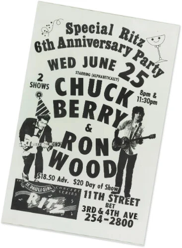 USA PACKING & POSTAGE IS $10.00. PAYMENT DUE WITHIN 3 DAYS. In this auction is: 1986 The Ritz PRESS PASS for Chuck Berry Ronnie Wood 6th anniversary concert This is an original and just removed from a binder it had been stored in. I looked this up and was from the Chuck Berry & Ronnie Wood 6th Anniversary concert at The Ritz and the collection this came from was someone who was invited that was in the music industry. This is 100% real over 37 years old. The Ritz part is on cloth with some writing on back that probably was related to the gig. The picture of the flyer is not included and is used as a prop only. USA shipping only. ?'s please ask.