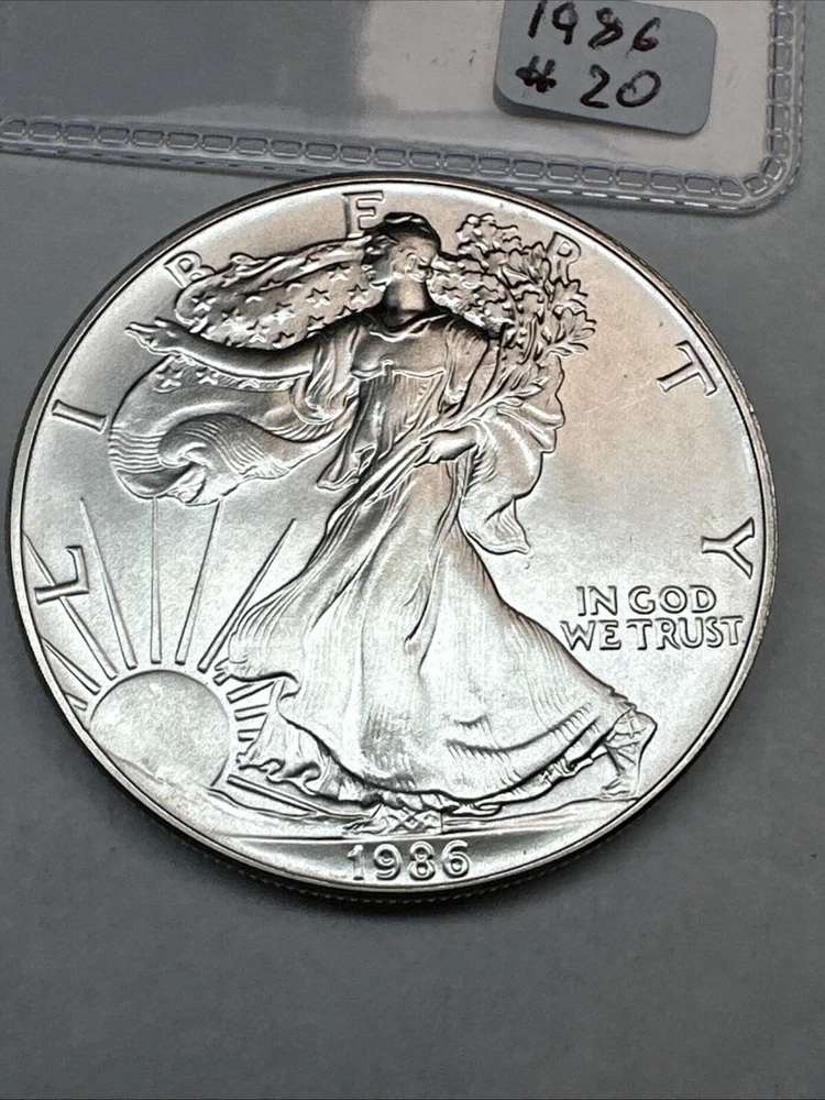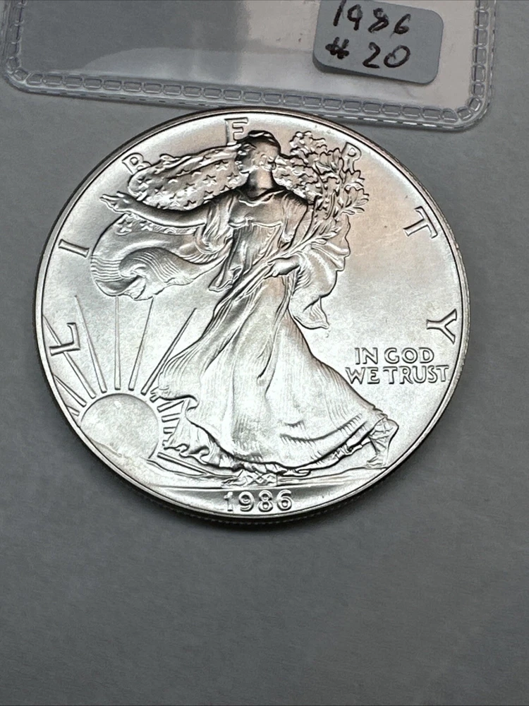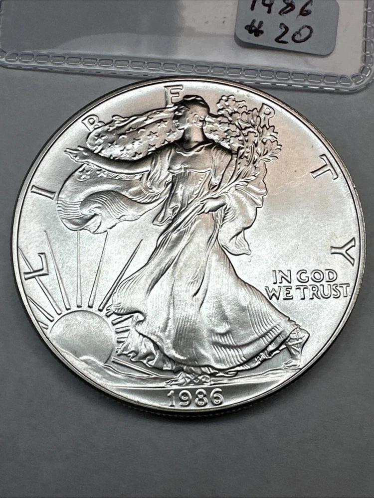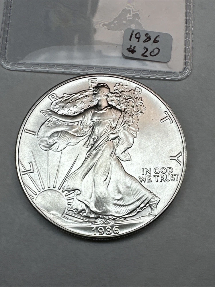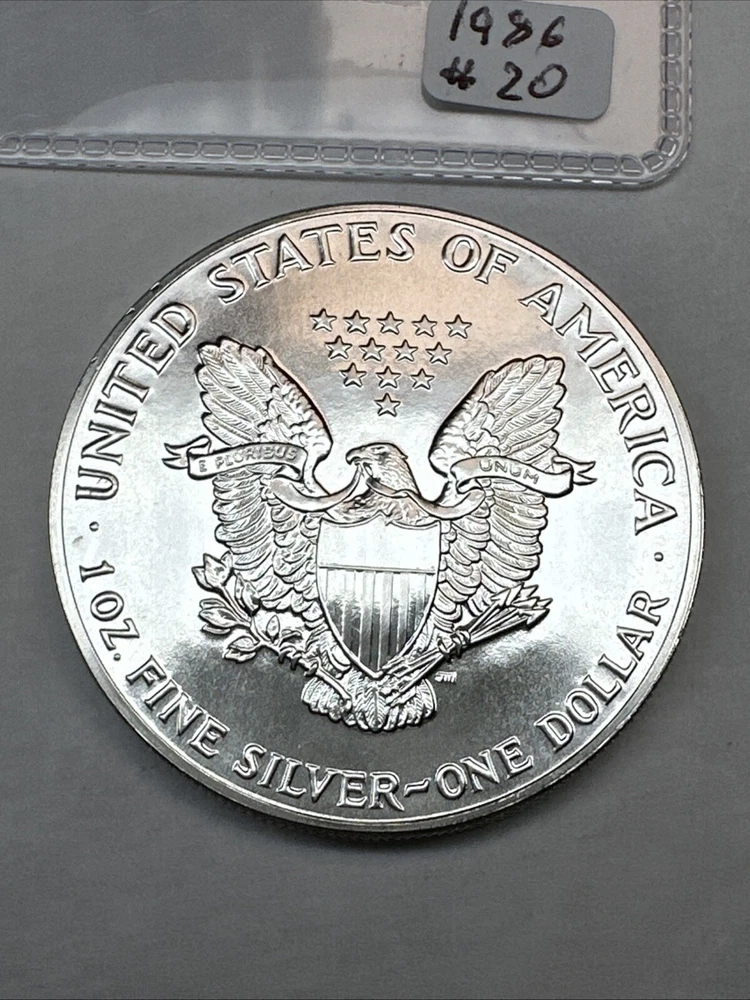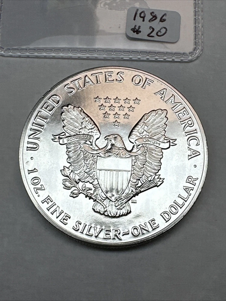 This product is a 1986 Uncirculated Silver American Eagle coin, minted by the U.S. Mint. It contains 1 oz of 0.999 fine silver. The coin features a business strike type and is ungraded and uncertified. It is a valuable piece for collectors and investors alike.