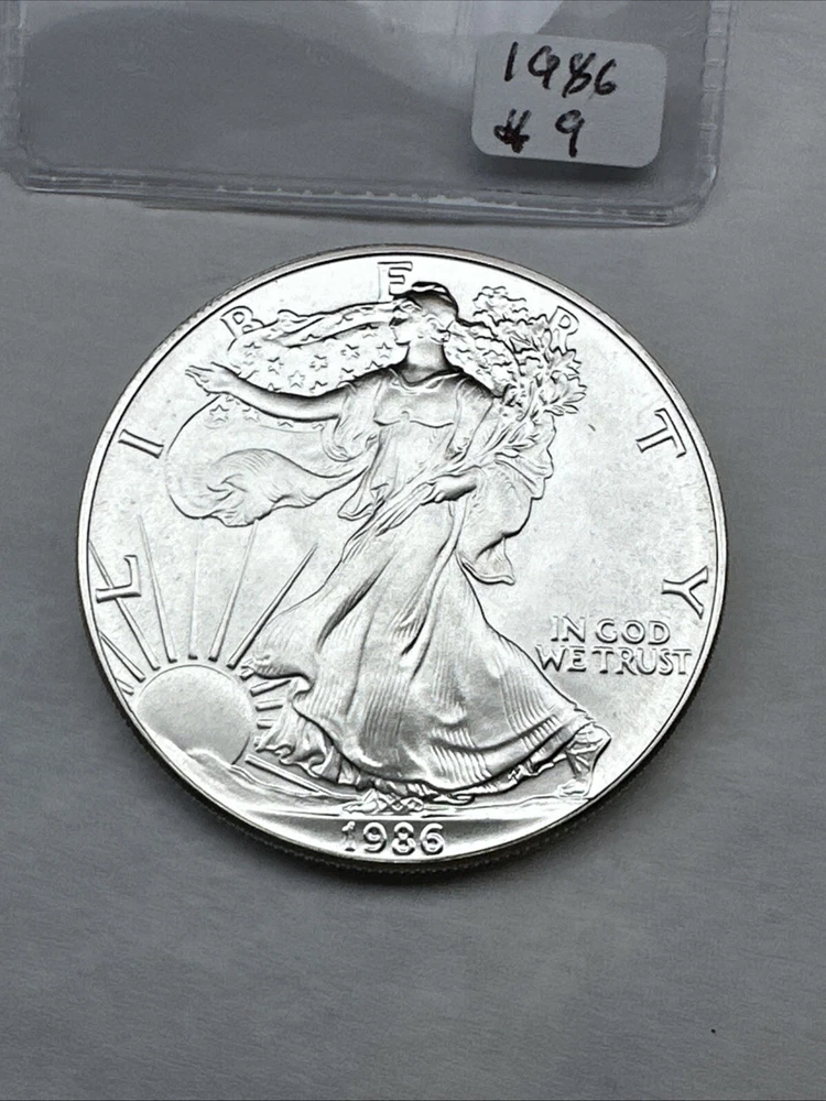 The product is a 1986 Uncirculated Silver American Eagle coin minted by the U.S. Mint. It contains 1 oz of 0.999 fine silver, making it a valuable bullion investment. This coin features the iconic American Eagle design and is a highly sought-after collectible item for coin enthusiasts and investors alike.