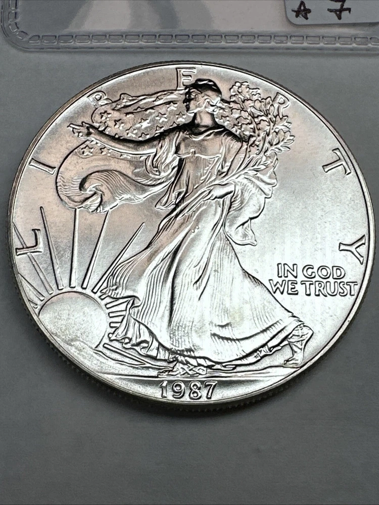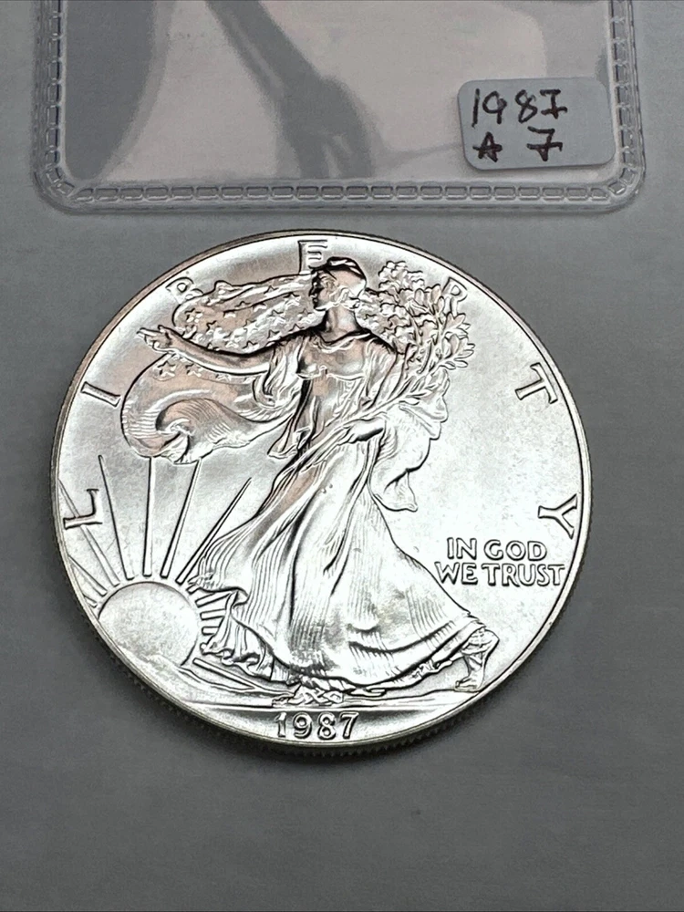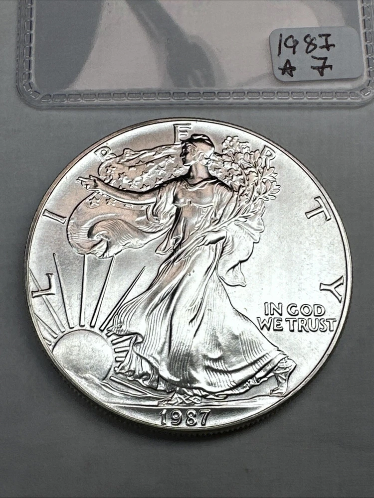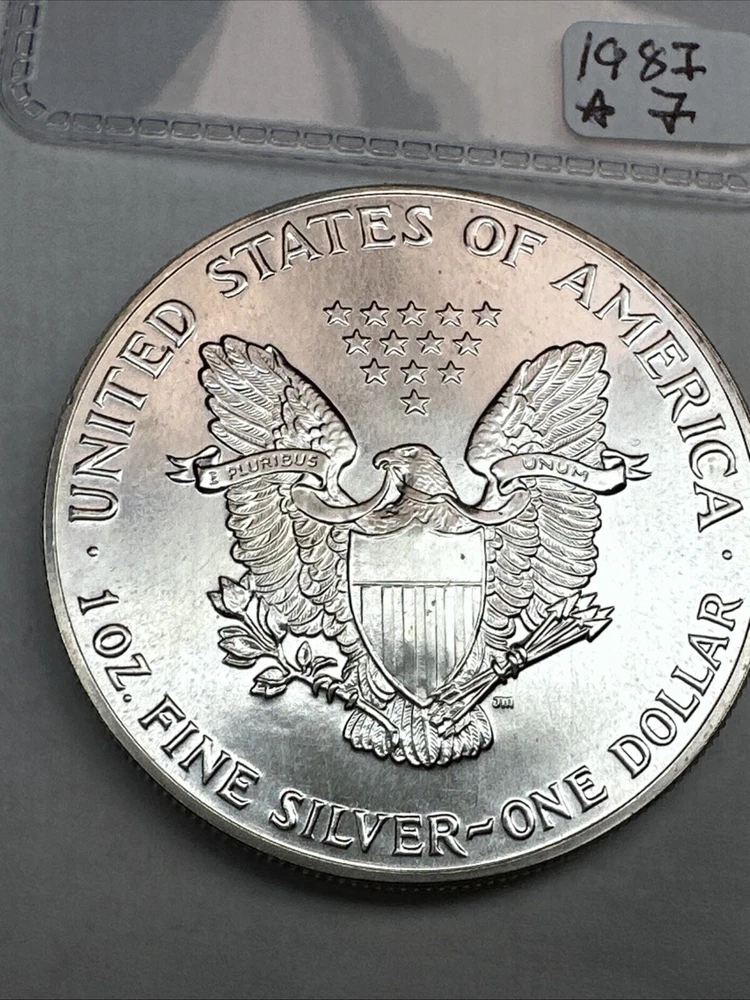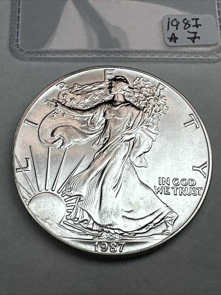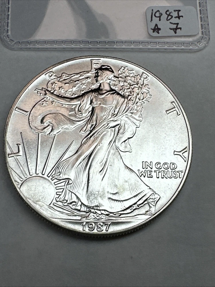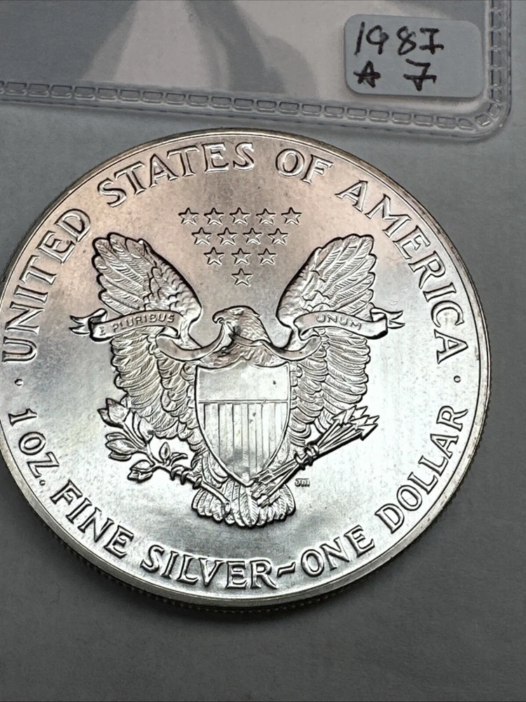 Certification: Uncertified Year: 1987 Total Precious Metal Content: 1oz Brand/Mint: U.S. Mint Strike Type: Business Grade: Ungraded Precious Metal Content per Unit: 1 oz Country/Region of Manufacture: United States Brand: Silver Eagle Fineness: 0.999 Composition: Silver Coin: American Eagle