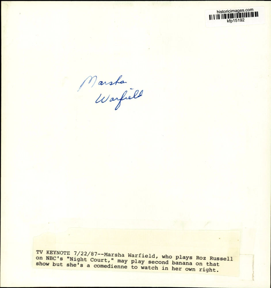 ebay template Note: Please study the images carefully to determine the condition of this vintage photograph, as it may not be in perfect condition. It may contain wrinkles, cracks, and possibly even tears due to its age and how it was handled before it got to us. A scanner may interpret colors and contrast differently than human eyes will, so it is possible that the actual photograph may be slightly darker or lighter in person. This vintage photograph is offered for sale as a collectible item and conveys no transfer of copyright. 1987 Press Photo "Night Court" NBC TV Series Actress Marsha Warfield - kfp15192 Marsha Warfield, who plays Roz Russell on NBC's "Night Court," may play second banana on that show but she's a comedienne to watch in her own right. Photo measures 8 x 8.5 inches. Photo Is dated 1987. PHOTO FRONT PHOTO BACK Historic Images Part Number: kfp15192 Sell Smarter with Kyozou. Inventory and Ecommerce Management