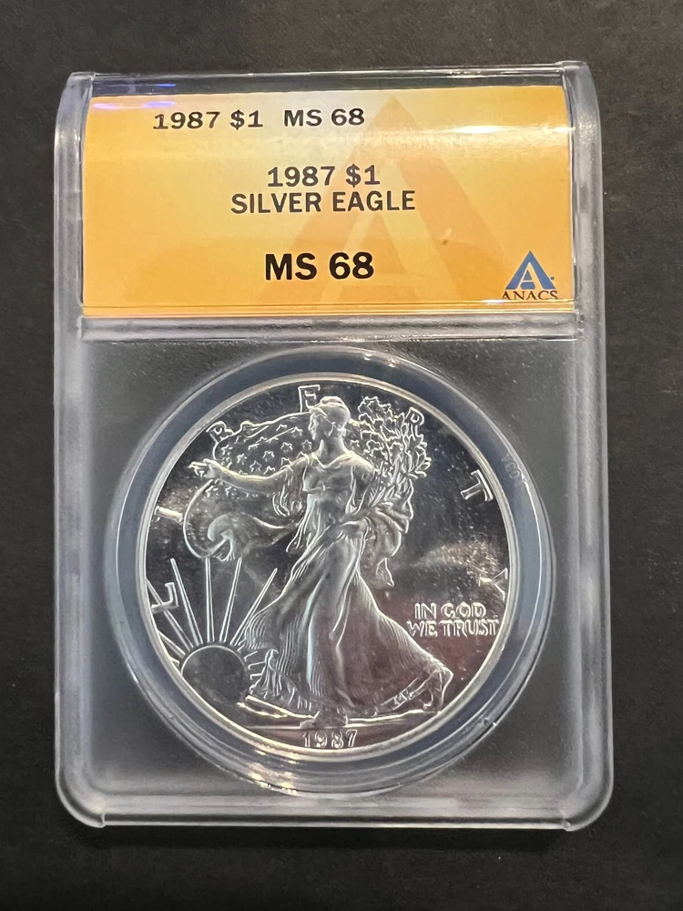 Precious Metal Content per Unit: 1 oz Strike Type: Business Composition: Silver Certification: ANACS Fineness: 0.999 Country/Region of Manufacture: United States Year: 1987 Grade: MS 69 Brand/Mint: U.S. Mint