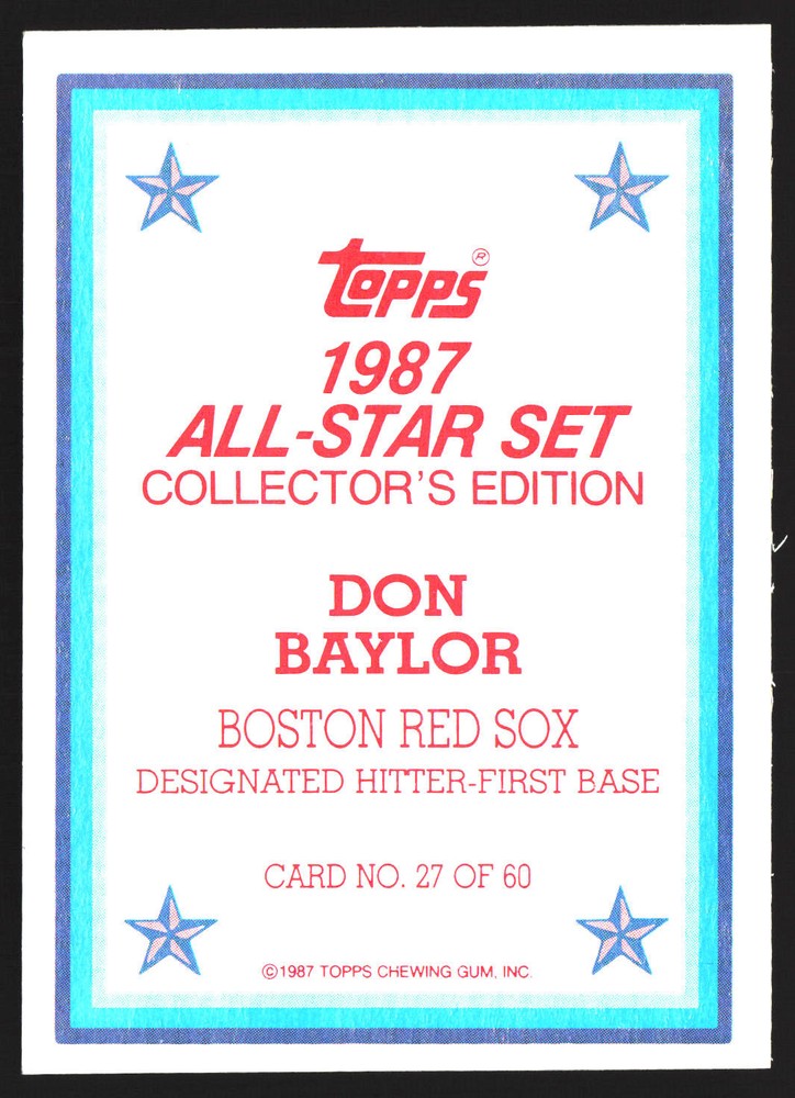 The Card pictured is the card you will receive unless there are multiple quantities then you will receive a card in the comparable grade. Cards in poor condition could have creasing, stains, rounded corners, pen marks or a combo of them. please see pics for a better understanding of cards condition. Very Good Boston Red Sox 1987 All-Star Set Collector's Edition (Glossy Send-Ins) Don Baylor #27 1987 Topps Topps 1987 Baseball .