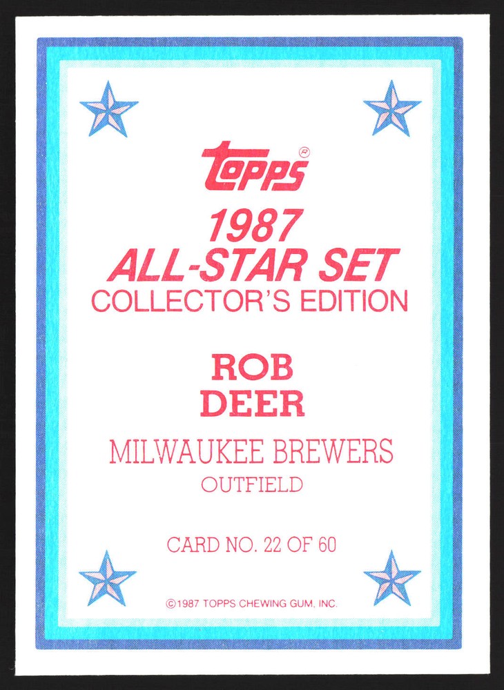 The Card pictured is the card you will receive unless there are multiple quantities then you will receive a card in the comparable grade. Cards in poor condition could have creasing, stains, rounded corners, pen marks or a combo of them. please see pics for a better understanding of cards condition. Very Good Milwaukee Brewers 1987 All-Star Set Collector's Edition (Glossy Send-Ins) Rob Deer #22 1987 Topps Topps 1987 Baseball .