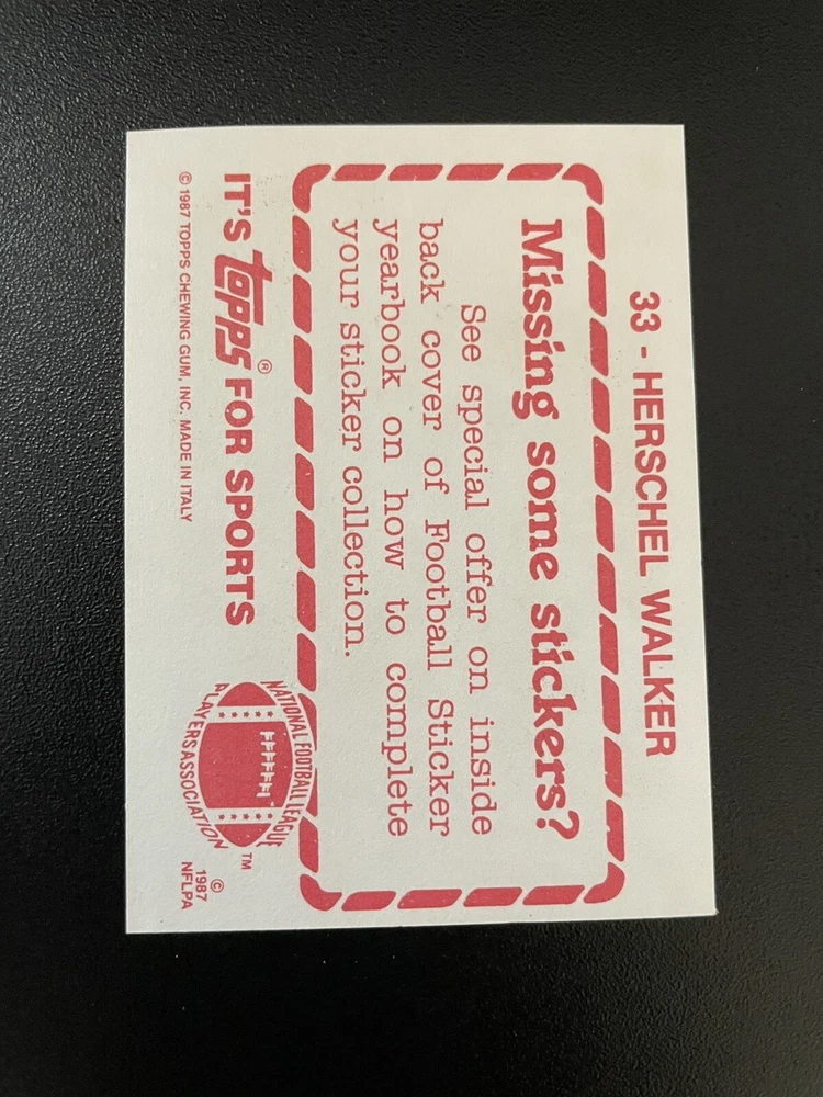 This 1987 Topps Stickers trading card features Herschel Walker, a former professional football player who played for the Minnesota Vikings and Dallas Cowboys in the National Football League (NFL). The card is part of the 1987 Topps set and is numbered 33. It is a must-have for any collector, especially those who are fans of football and enjoy collecting sports trading cards. The card is in excellent condition and showcases Herschel Walker as a rookie player. It is a great addition to any collection and would make a perfect gift for any football enthusiast. Don't miss out on the opportunity to own a piece of NFL history with this 1987 Topps Stickers Herschel Walker Rookie Rc trading card.