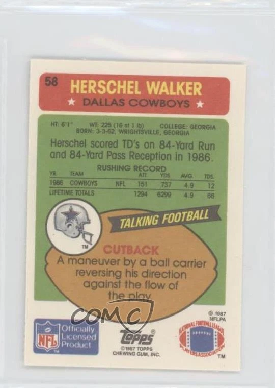 1987 Topps United Kingdom American Football - [Base] #58 Herschel Walker - Rookie - Football Card - Featuring the Dallas Cowboys - Featuring Herschel Walker Search for more: 1987 Topps United Kingdom American Football Search for more: 1987 Topps United Kingdom American Football - [Base] View all of our Listings Auctions Buy It Now About Us Located in the beautiful Pacific Northwest, COMC (Check Out My Cards) is the world's largest consignment service for trading card singles. More than 10,000 people have used our consignment service to list over 50 million trading cards. We currently house 20 million cards, each listed for sale with front and back images of the actual card. Find out how we can help you consign your items on eBay by contacting us through eBay messaging. COMC -- "The Safe & Easy Way to Buy & Sell" Representative Image - Select Specific Item above to see image of actual item Representative Image - Select Specific Item above to see image of actual item Raw Condition for Modern Cards Unless otherwise noted, raw modern cards are listed in Near Mint-Mint condition or better. A NM-MT card appears to be Mint at first glance, but upon closer inspection, may exhibit some of the following: minor print defects (e.g. roller marks, print line, dimple), minor scratches, slight edge wear, and slight corner wear. Centering is clearly visible in the images provided and does not factor into our condition assessment. Raw Condition for Vintage Cards Unless otherwise noted, raw vintage cards are listed in Excellent condition or better. An EX card may exhibit some of the following: minor rounding of corners, surface wear, print defects, light scratches, and slight edge wear/chipping. Centering is clearly visible in the images provided and does not factor into our condition assessment. Domestic Shipping Combined shipping for multiple items is available. To receive combined shipping, please ensure all desired items are in your eBay shopping cart before proceeding to checkout. eBay limits orders to 40 items per order. We automatically combine multiple orders placed on the same day. If you place multiple orders on the same day, please contact us to request a refund of applicable shipping costs. Signature confirmation may be required on invoices over $400. Raw cards are shipped in toploaders. International Shipping COMC offers eBay's International Shipping (EIS) for international orders under $2,500* (see country exceptions below). All duties and import fees are paid at checkout; in the rare event that there are additional import fees upon delivery, these are borne by the buyer. EIS packages route through a shipping hub in Erlanger, KY before shipping to their final destination. Please note that EIS does not allow for combined shipments. The shipping rates are determined by eBay and cannot be adjusted. *Maximum sale price exceptions: Colombia, Kuwait ($2,000); Taiwan ($1,539); Chile, Costa Rica, Guatemala, Honduras, Trinidad and Tobago ($1,000); Antigua and Barbuda, Aruba, Belize, Dominica, Grenada, Philippines, Saint Kitts and Nevis, Saint Lucia, Montserrat, Turks and Caicos Islands ($500); Dominican Republic, El Salvador ($200). Please request a shipping quote through eBay messaging for orders that exceed the maximum sale price supported by eBay's International Shipping. You will be responsible for all duties and import fees for international orders shipped outside the EIS. Raw cards are shipped in toploaders. Payment COMC does not accept offers on our cards through our eBay storefront. COMC utilizes eBay’s managed payments system. If you are experiencing difficulties making a payment, please contact eBay for assistance. Return Policy Returns are only accepted on the rare occasion the item is not as described. If you are making a return, please initiate the return process through eBay so a mailing label can be provided for you. Prior to listing, our expert team carefully assessed this item to represent it accurately. Please review the description and high-definition images prior to purchasing to ensure this item meets your satisfaction. We welcome you to contact us if you have further questions about this item. Trust and Integrity COMC carefully assesses each item consigned to us to prevent fraudulent items from entering the marketplace. If you believe an item offered on COMC may be fraudulent, please contact us with details so we can investigate the issue. Items we determine are outside our supported items policy may be removed. Last Modified: 11/25/2024 4:41:43 AM PDT