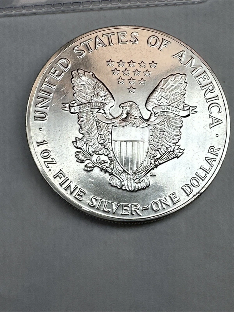The product is a 1988 American Silver Eagle coin, minted by the U.S. Mint. It contains 1 oz of .999 fine silver, marked with a business strike type. The coin features the iconic Silver Eagle design and is certified as Brilliant Uncirculated.