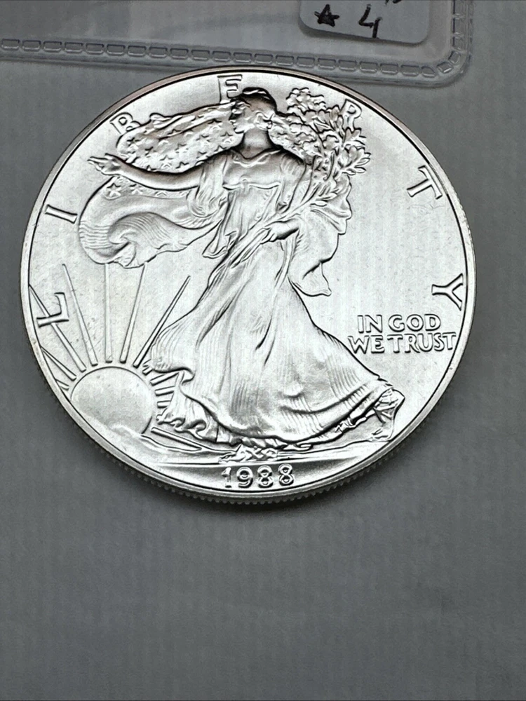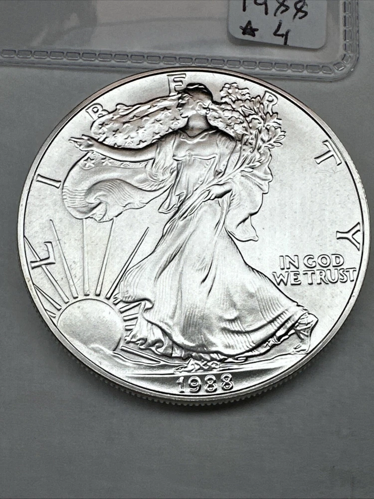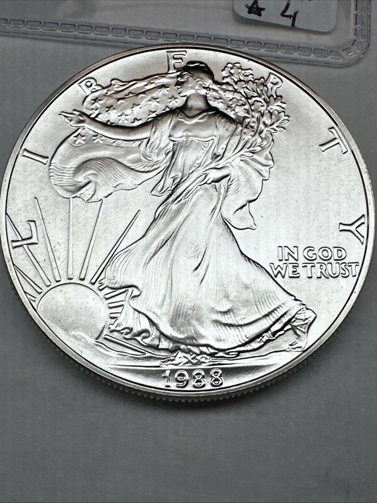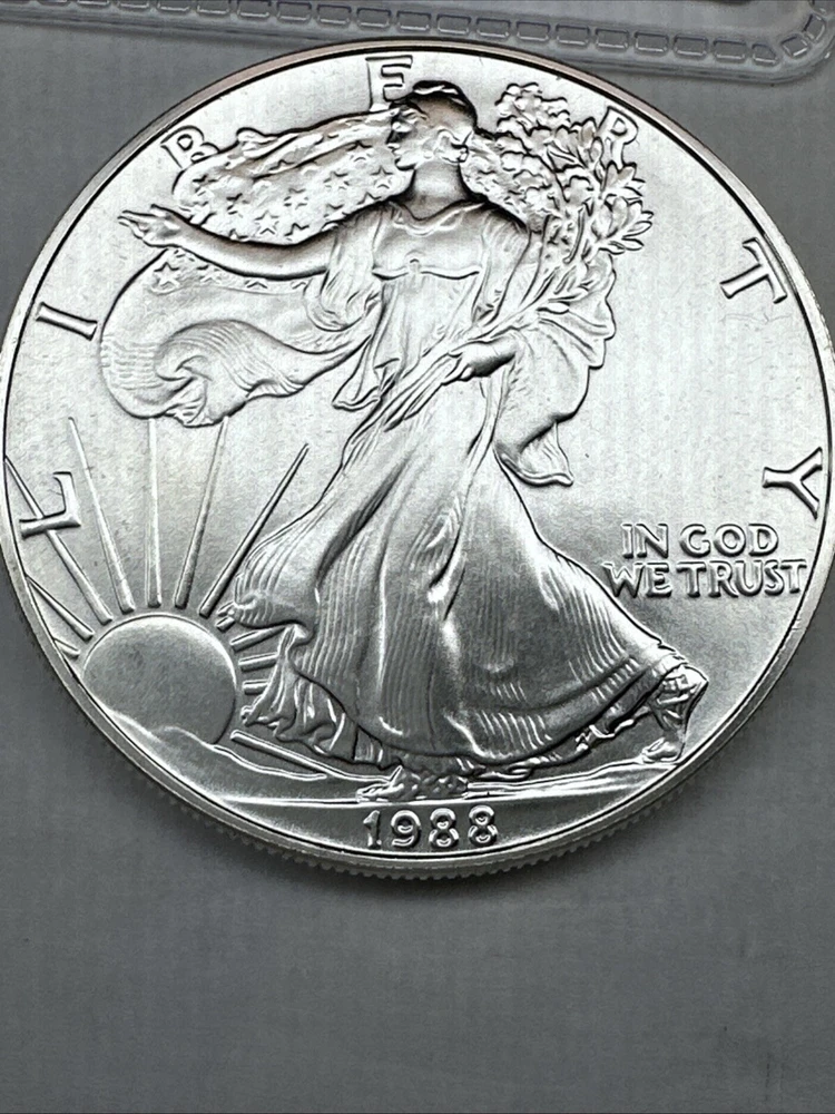 The product is a 1988 American Silver Eagle coin, minted by the U.S. Mint. It contains 1 oz of .999 fine silver, marked with a business strike type. The coin features the iconic Silver Eagle design and is certified as Brilliant Uncirculated.