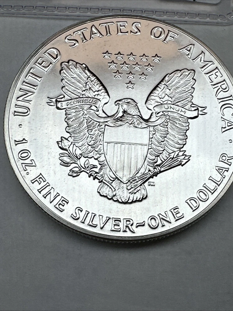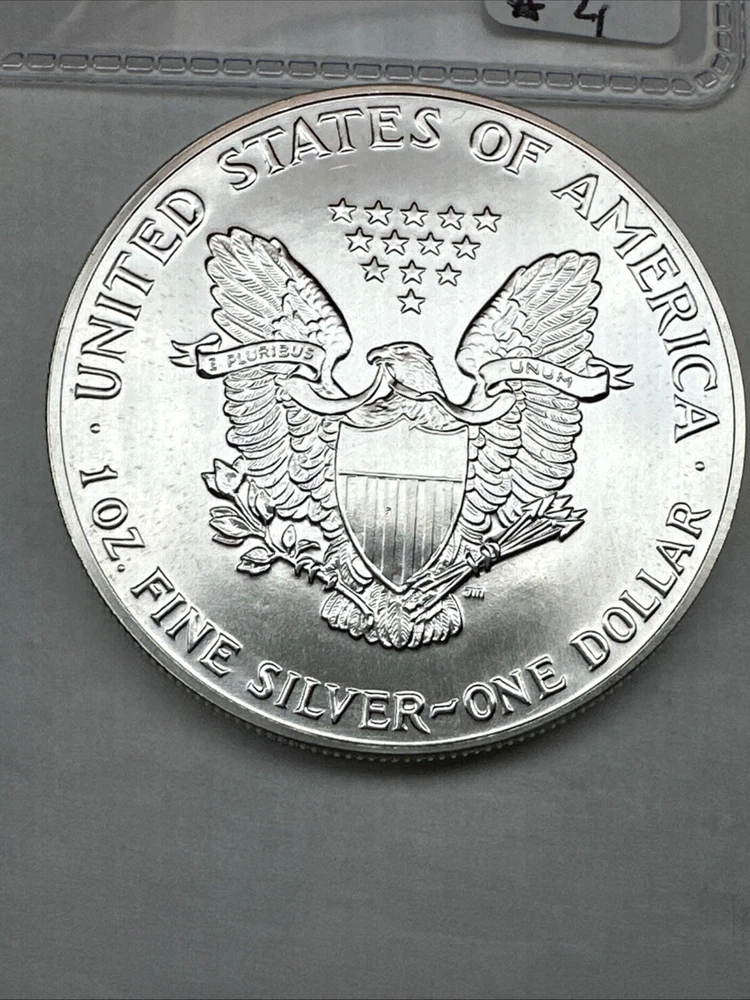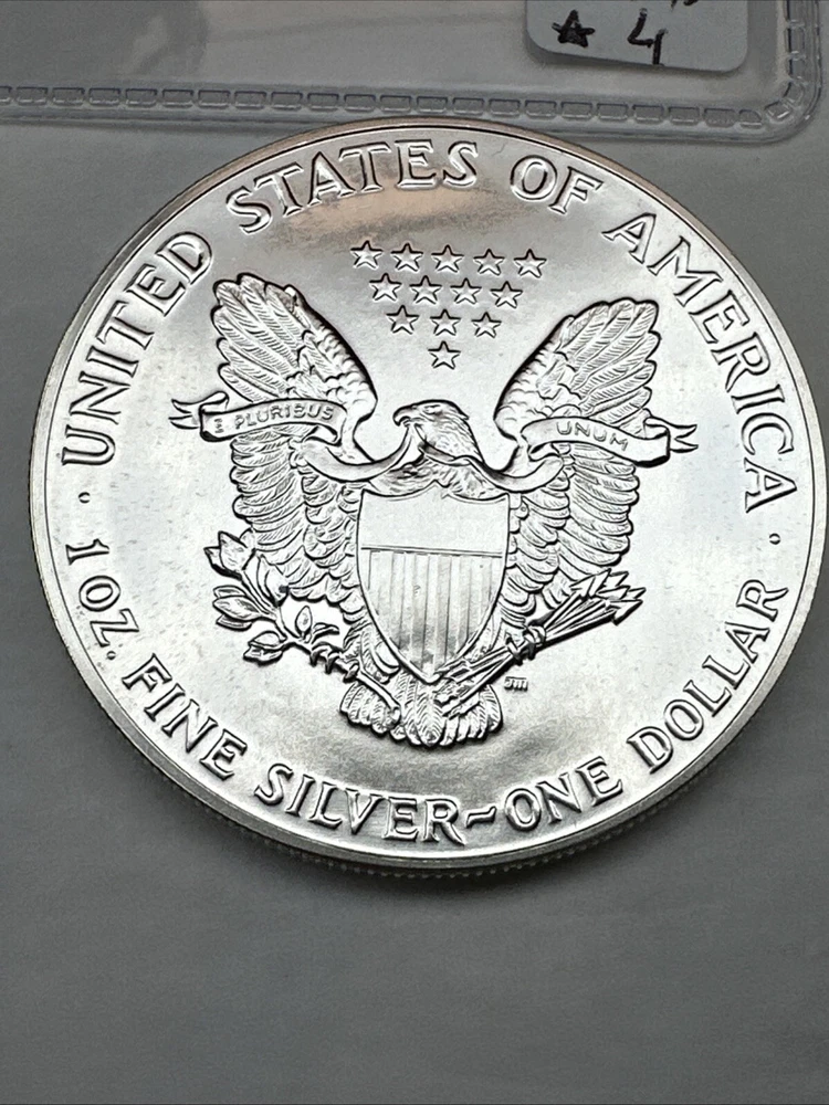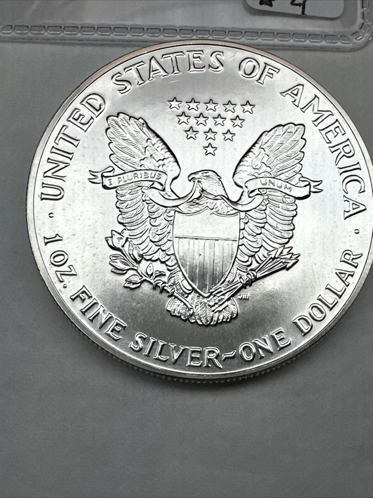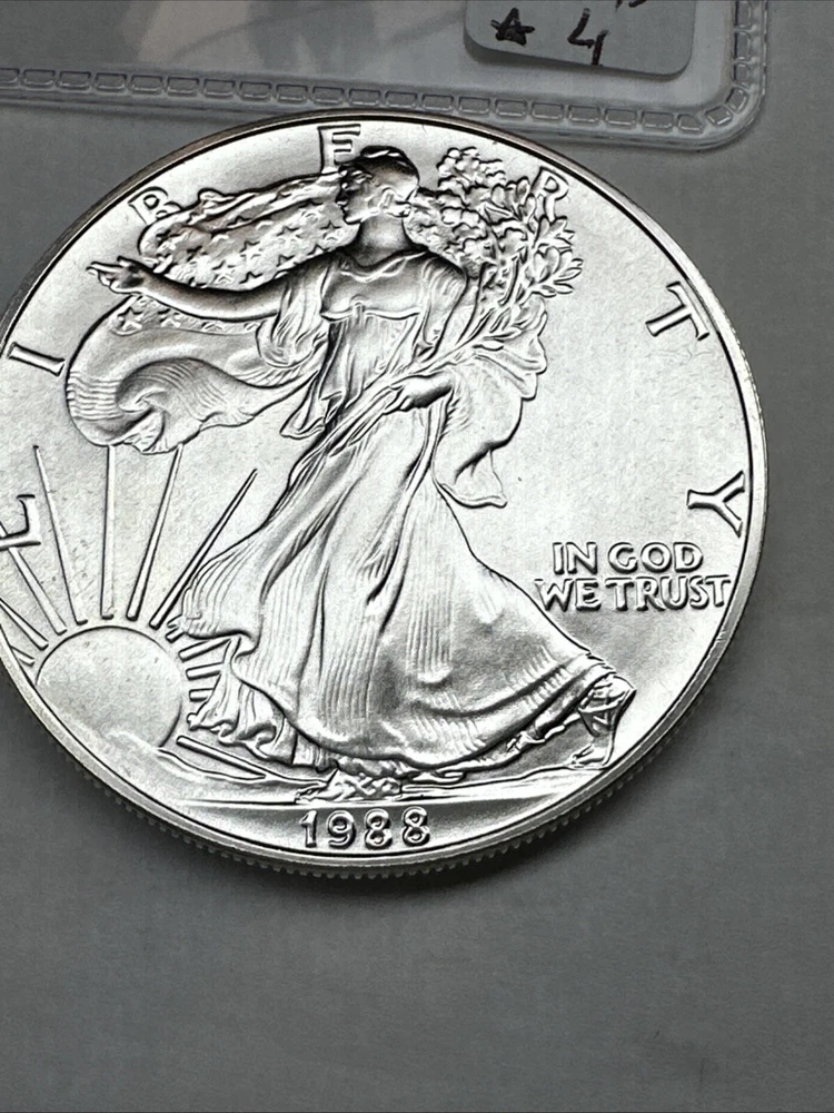 The product is a 1988 American Silver Eagle coin, minted by the U.S. Mint. It contains 1 oz of .999 fine silver, marked with a business strike type. The coin features the iconic Silver Eagle design and is certified as Brilliant Uncirculated.