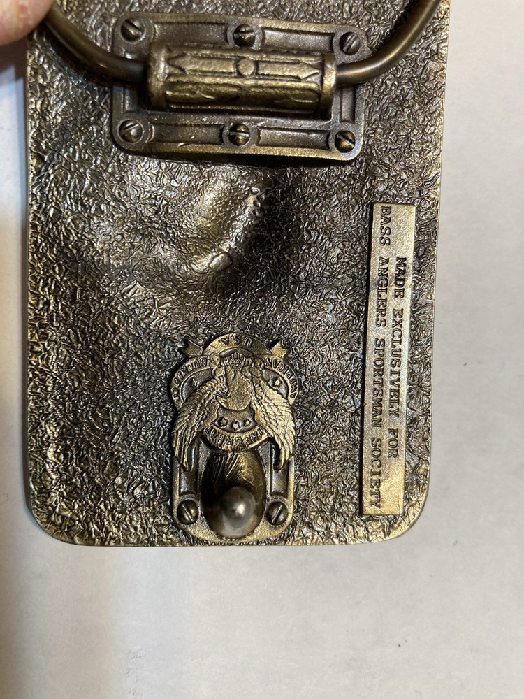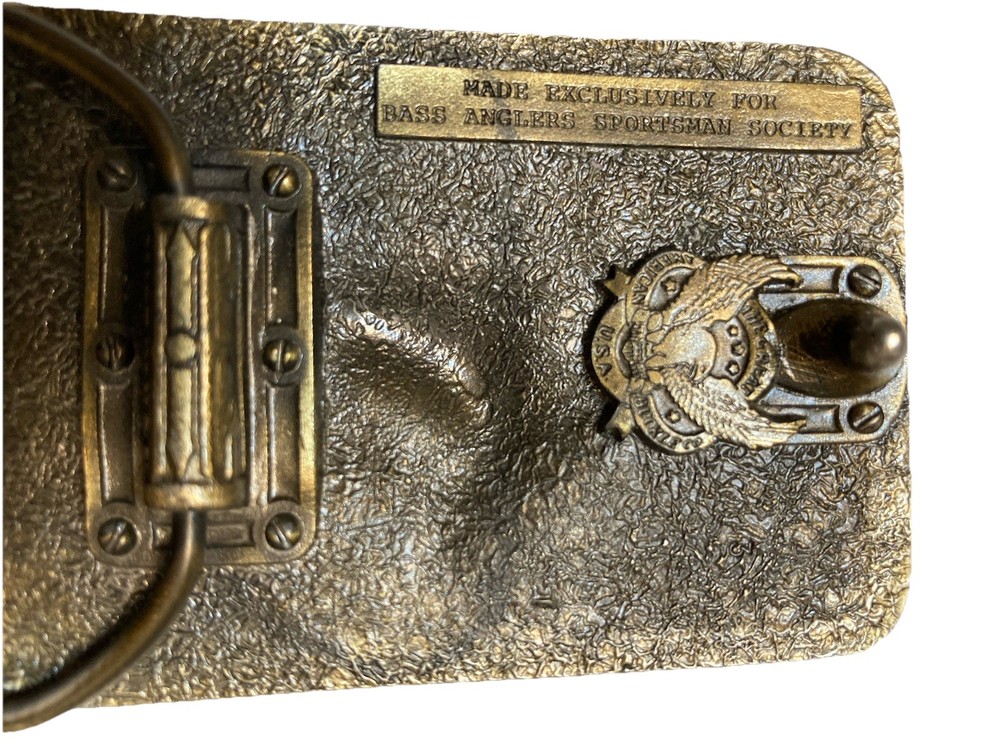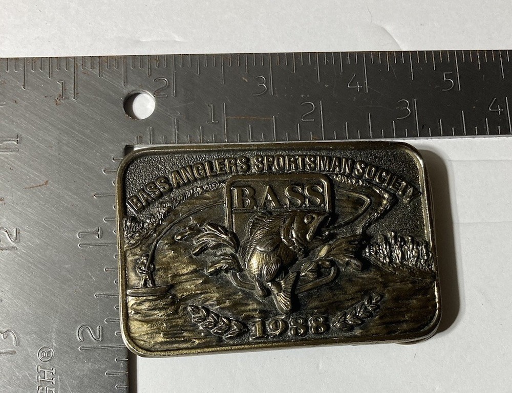 This is a heavy brass belt buckle from The Great American Buckle Company. It features the logo of the Bass Anglers Sportsman Society from 1988. The buckle is perfect for any fishing enthusiast looking for a unique accessory.