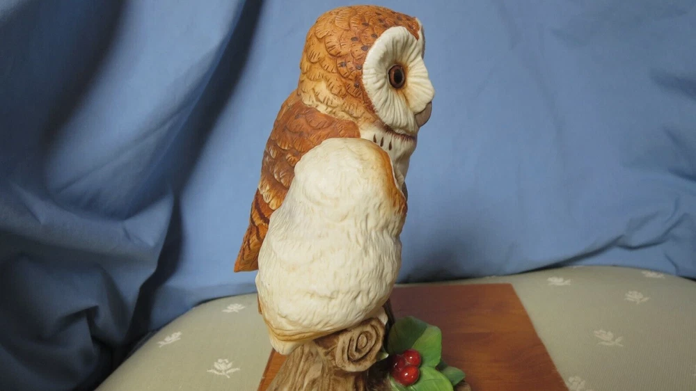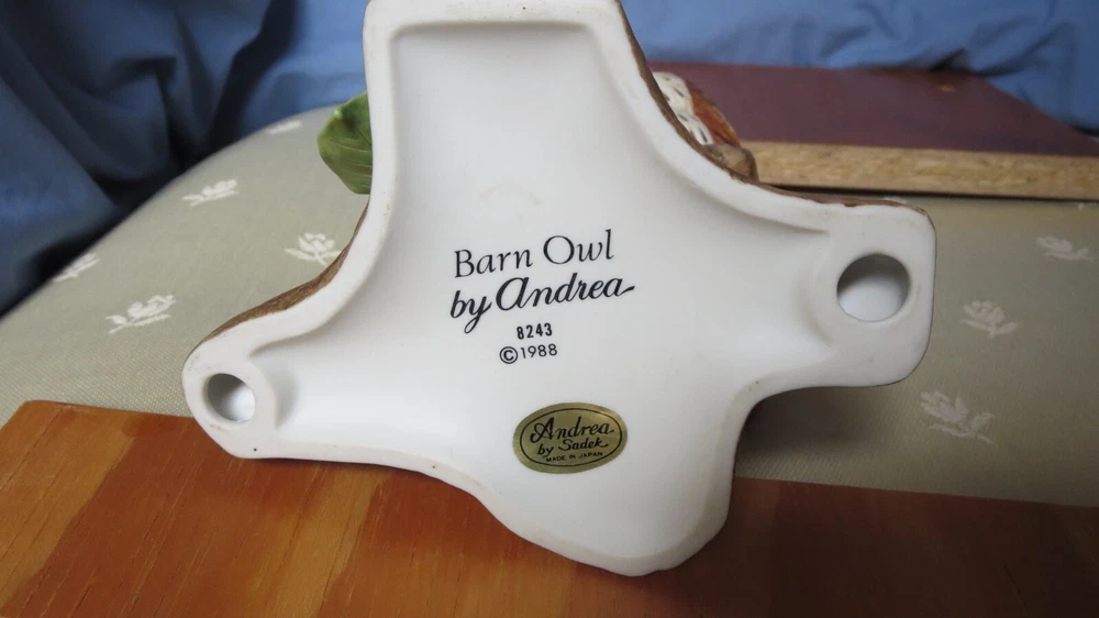 This Barn Owl Porcelain Bird Art Sculpture from 1988 by Andrea Sadek is a small, multicolored sculpture featuring an owl. Made of porcelain in Japan, it is part of a collection of owls and has a traditional style. The sculpture is matte finished and suitable for any room in the house, making it a versatile piece for wildlife enthusiasts or collectors of animal-themed decor.