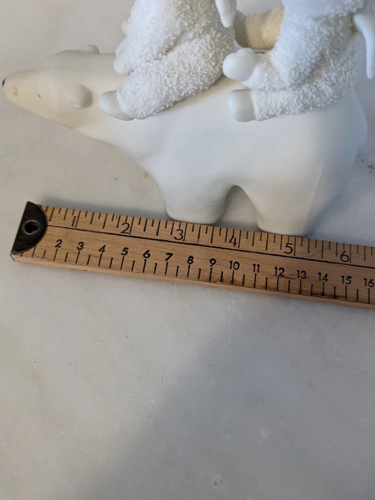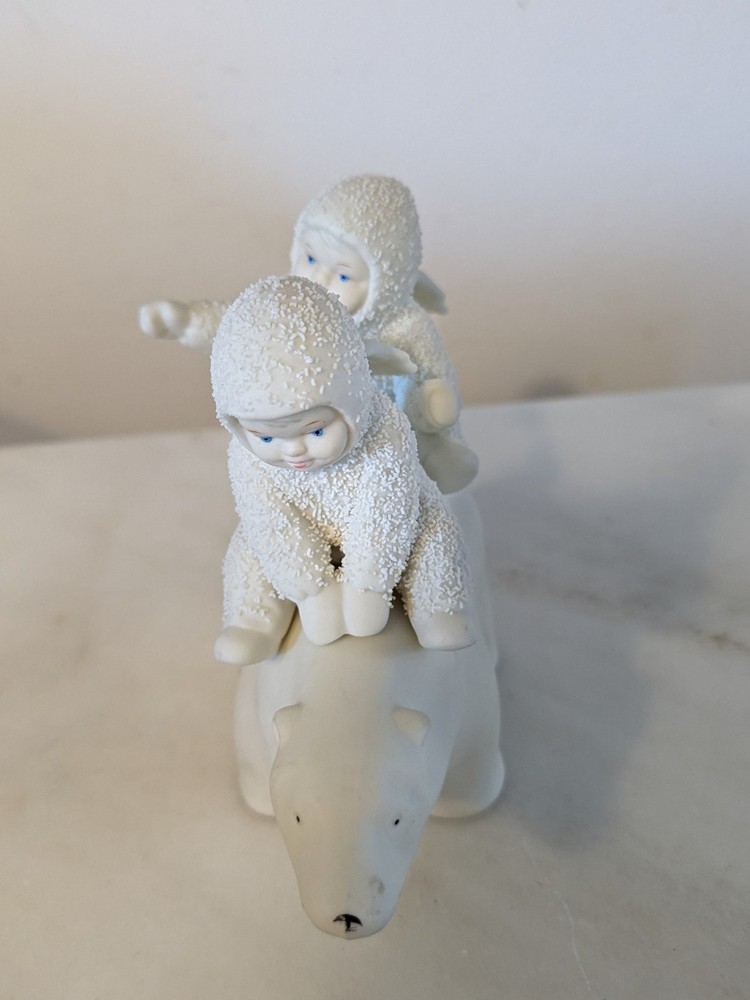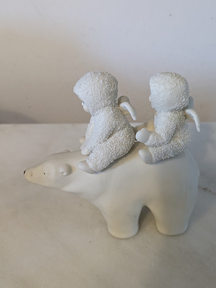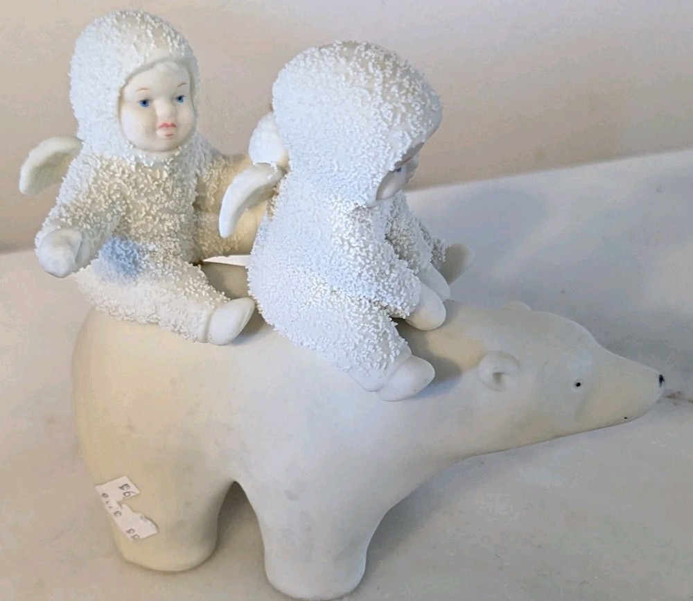 The 1988 Dept 56 Snowbabies "Polar Express" Angel Snowbabies Riding Polar Bear figurine is a medium-sized collectible piece made of porcelain. This multicolor figurine depicts angelic Snowbabies riding a polar bear, making it a charming addition to any Christmas or winter-themed decor. Manufactured by Department 56, this original and retired piece features a matte finish and stands at 6 inches in length and 5 inches in height. Perfect for collectors of holiday and seasonal figurines, this piece captures the essence of the holiday season with its festive design and nostalgic theme.