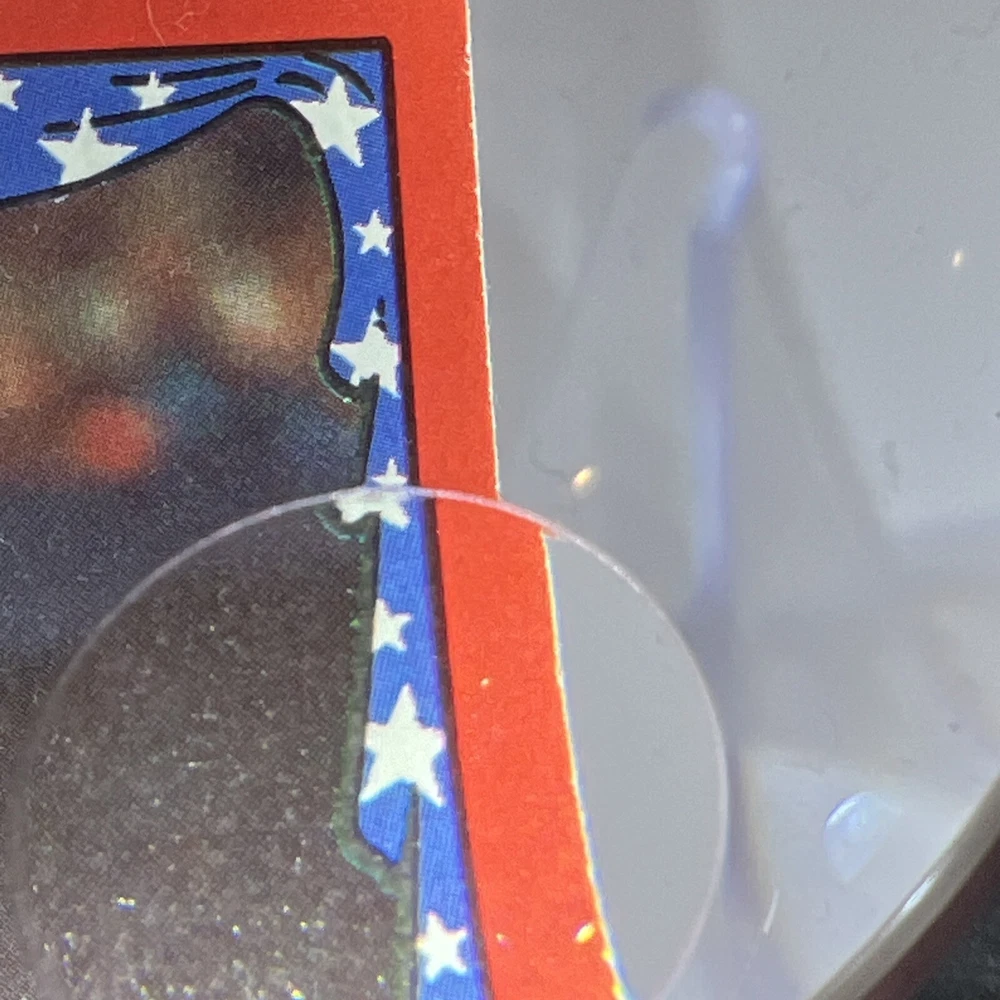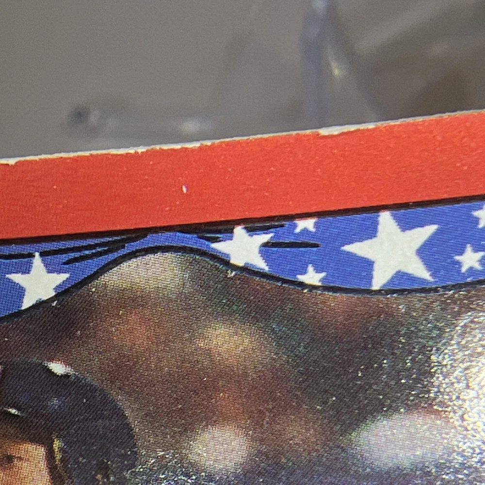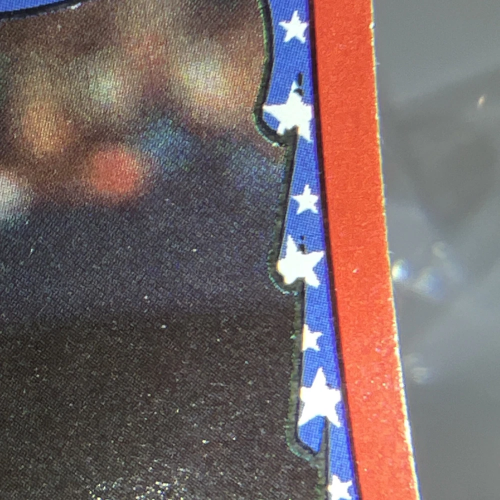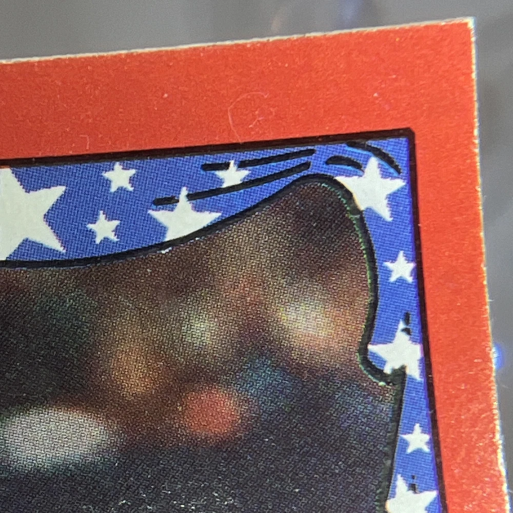 Card has some ink print errors around the blue flag and stars. Green ink stars over lapping the borer.