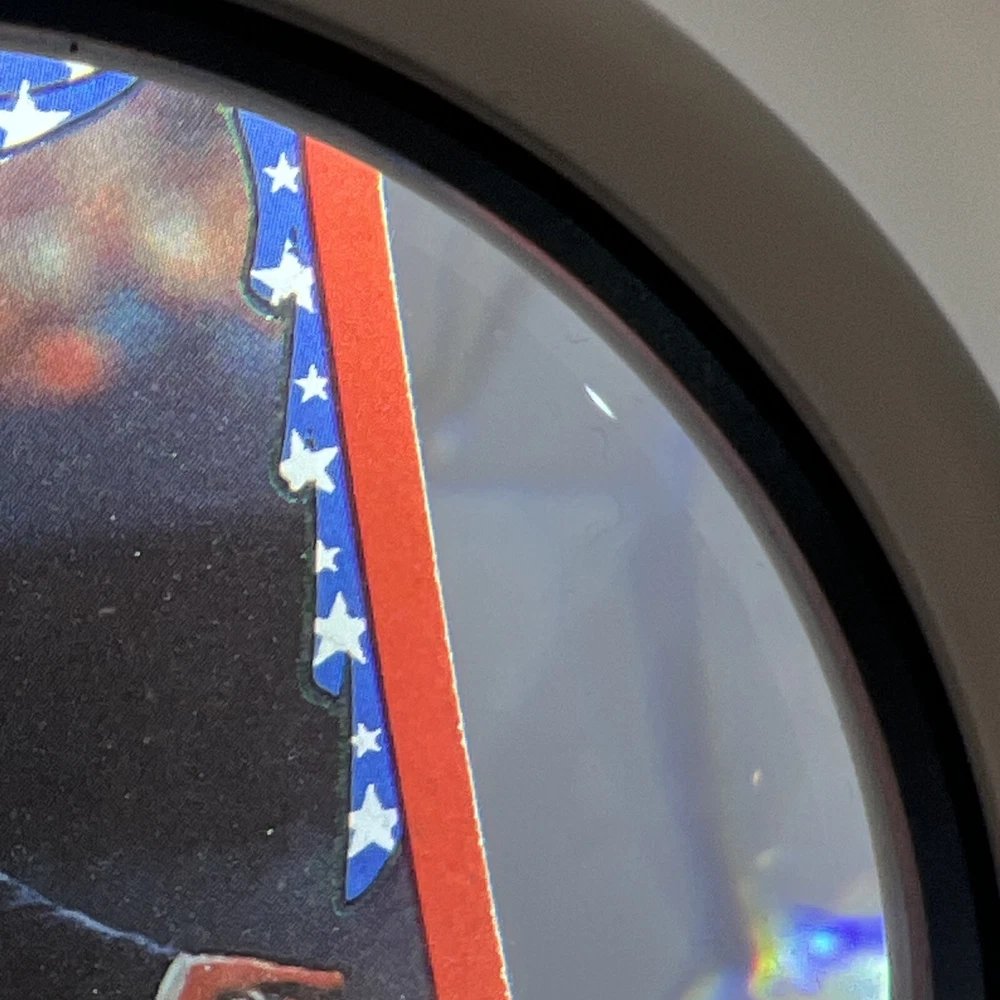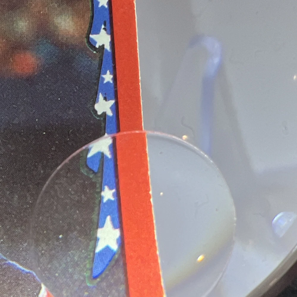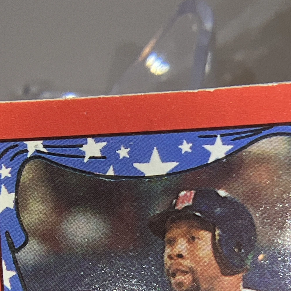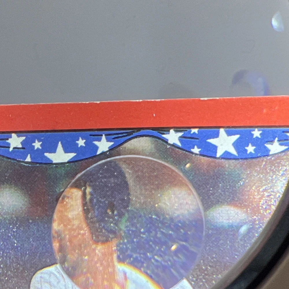 Card has some ink print errors around the blue flag and stars. Green ink stars over lapping the borer.