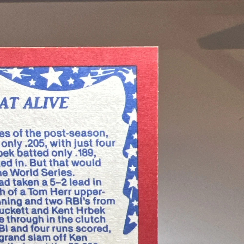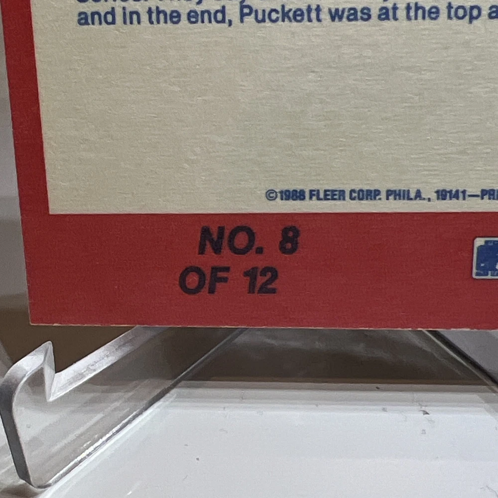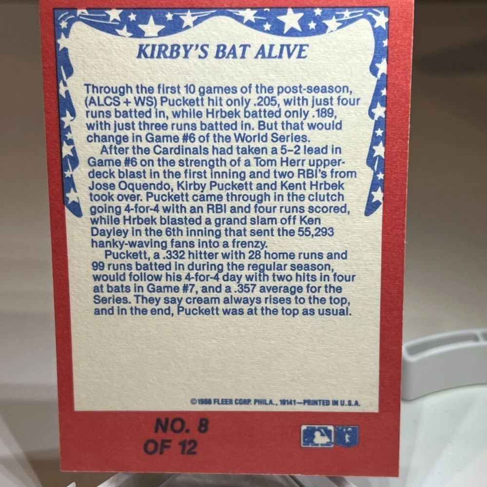 Sport:BASEBALLParallel/Variety:World SeriesManufacturer:FleerCard Number:8Insert Set:World SeriesSet:1988 FleerLeague:MLBPlayer/Athlete:Kirby's Bat Comes Alive in Game 6Team:Minnesota TwinsType:Sports Trading CardSeason:1988Year Manufactured:1988Autographed:No