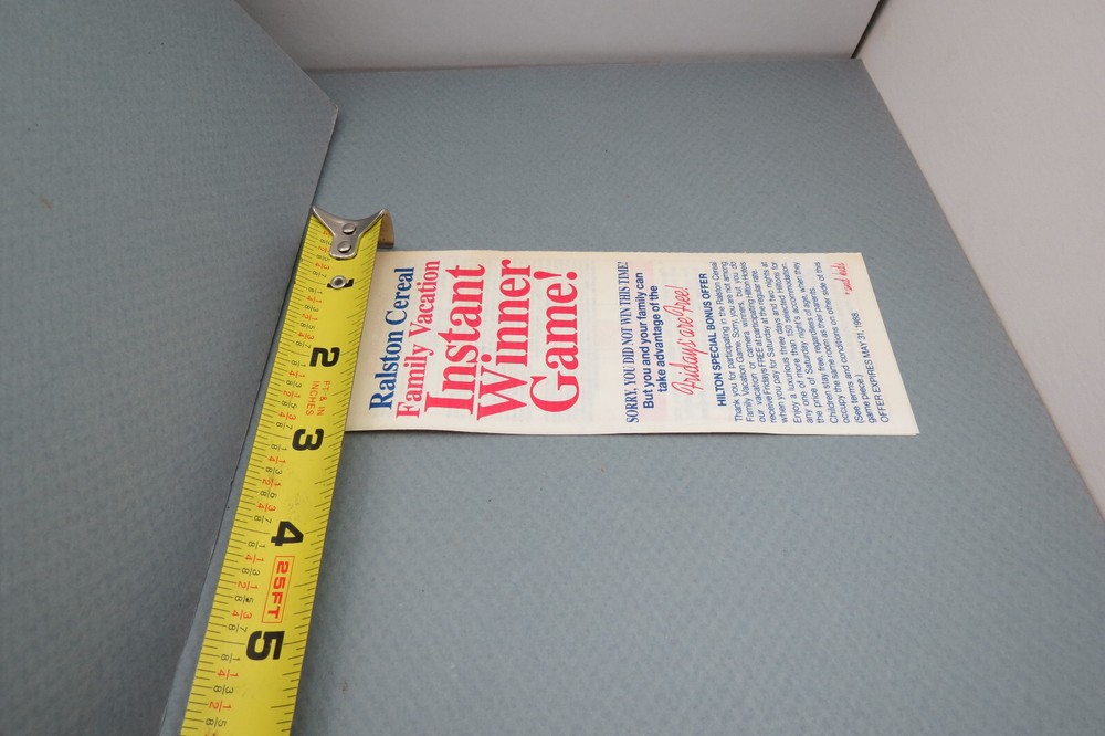 This is a rare and unique piece of collectible advertising from Ralston Cereal. The 1988 Box Insert Family Vacation Game Piece & Ry-Krisp Coupon is a must-have for any cereal or advertising enthusiast. The piece features a white color scheme and was manufactured in the United States. It is an original and authentic collectible item that will make a great addition to any collection. The game piece is perfect for display or play, and the Ry-Krisp Coupon adds to the overall value of the item. This piece is a great representation of the cereal's brand and type of advertising, making it a valuable addition to any collection. The game piece tells you whether you were an instant winner of the family vacation, and in that notice gives you a coupon for Hilton as well as the coupon for the Ry-Krisp