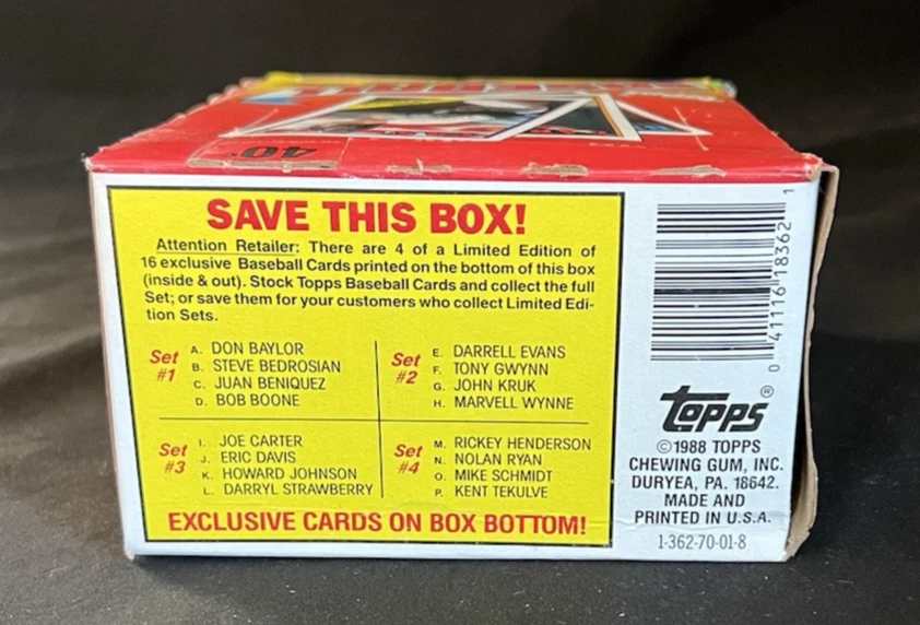 1988 Topps Baseball Wax Box 36 Sealed Packs Tom Glavine Rookie Ken Caminiti 36 Packs Per Box, 15 Cards Per Pack = 540 Cards This set consists of 792 standard-size cards. Card fronts feature white borders encasing a color photo with team name running across the top and player name diagonally across the bottom. Subsets include Record Breakers (1-7), All-Stars (386-407), Turn Back the Clock (661-665), and Team Leaders (scattered throughout the set). The manager cards contain a team checklist on back. The key Rookie Cards in this set are Ellis Burks, Ken Caminiti, Tom Glavine, and Matt Williams. Look for Key Rookies & Hall of Famers in High Grade Tom Glavine Rookie Ken Caminiti Rookie Matt Williams Rookie Barry Bonds Bo Jackson Nolan Ryan Don Mattingly Barry Larkin Will Consider Reasonable Offers. Please see the high-res images for details. Feel free to reach out with any questions or if you're looking for something specific. Please follow the Big Joe Knows Cards Store for new items coming soon! We’ll be listing from a large and carefully curated collection of Vintage & Modern Baseball, Basketball, Football, Hockey, Garbage Pail Kids, Magic: The Gathering, Marvel, Pokémon, and Disney cards, etc. CONTENTS OF UNOPENED PACKS: - With the exception of the players visible on the front and/or back of a pack, there are no guarantees about the contents of any unopened material. Higher value packs have been authenticated and/or graded by the foremost industry experts from PSA & BBCE. Packs that have not been wrapped or graded by BBCE or PSA are being SOLD AS FACTORY SEALED . If you have any questions about the authenticity of any product being sold, please feel free to ask for additional photographs and/or information. ITEM(S) IN IMAGES: - Unless otherwise noted, the item(s) in the images are of the exact product that you will receive. Please be sure to review the high-resolution images. CARD CONDITION OF RAW/UNGRADED CARDS: - When assigning the condition of a card, we use the eBay card condition guidelines , which include i) Poor, ii) Very Good, iii) Excellent, and iv) Near Mint or Better. Please note, these four conditions (and standards) do not necessarily correspond directly with professional grading services. - When estimated grades are provided, they are being provided for evaluation purposes only. While the best efforts have been made to provide an accurate assessment of the condition of the cards, these estimates are not a guarantee of grades. Actual grades assigned by a professional grading service (PSA, SGC, etc.) may be lower or higher than the estimates that have been provided. - If there is an issue with the card that does not seem to show up in the scan, best efforts will be made to call them out in the ' Condition description ' section of the listing. When the word ' Mint ' is used in the listing title and/or description, it means that, in my opinion, the card has a very good chance on receiving a grade of 8 NM-MT, 9 Mint, or 10 Gem Mint from a reputable professional grading service like PSA. Again, this description is no guarantee of the actual grade that a card may receive and should be used for evaluation purposes only. SHIPPING & COMBINED SHIPPING: - We take great care to ensure that our collectibles arrive in the same condition that you purchase them. All of our shipments are insured, and we photograph/record the packaging of our high-end products. - When requested, we will do our best to combine shipping when multiple items are purchased. There is a $1.99 handling fee built into the shipping cost you see listed on each item. When shipping is combined, the total shipping cost will be equal to a) the actual cost of shipping the combined items via your preferred method; plus, b) a handling fee ($1.99 on the first item and $0.99 for each additional item). Typically, you will have the option to select eBay's Standard Envelope Shipping or USPS Ground Advantage. - Please note, when we ship raw/ungraded cards via eBay's Standard Envelope Shipping Program, the cards will be placed in a new penny sleeve inside a new Card Saver I. The card(s) are then placed into a cardboard mail stiffener secured by painter's tape. Due to the weight and size requirements of the Standard Envelope program, we cannot combine more than three (3) cards into a Standard Envelope. We will not combine shipping using eBay's Standard Envelope Program when the combined value of the cards exceeds $25. You will have the option to have the cards shipped individually using the Standard Envelope or combine up to fifty (50) cards with a combined value of up to $500 via USPS Ground Advantage.