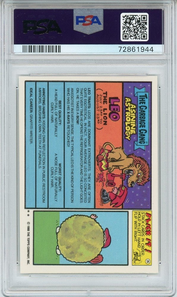 Autographed: No Card Size: Standard Set: Garbage Pail Kids - Series 15 Card Thickness: 20 Pt. Featured Person/Artist: John Pound Parallel/Variety: Base Vintage: Yes Subject Type: Cartoon/Parody Country/Region of Manufacture: United States Material: Card Stock Year Manufactured: 1988 Series: Original Series 15 Age Level: 8+ Genre: Comedy, Parody Grade: 10 Franchise: Garbage Pail Kids Type: Non-Sport Trading Card Original/Licensed Reprint: Original Character: Slasher Asher Card Name: Slasher Asher Certification Number: 72861944 Movie: The Garbage Pail Kids Movie TV Show: gpk Card Number: 617b Illustrator: Tom Bunk Language: English Features: Base Set, Sticker, Die-cut Manufacturer: Topps Professional Grader: Professional Sports Authenticator (PSA) Print Run: 1st Print Insert Set: Base