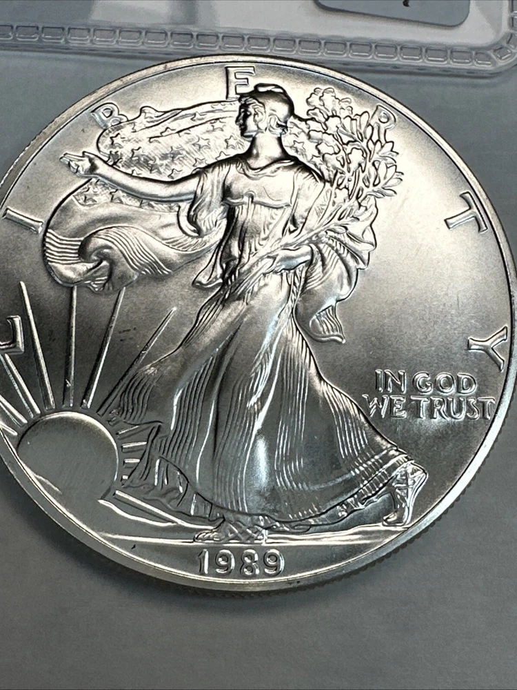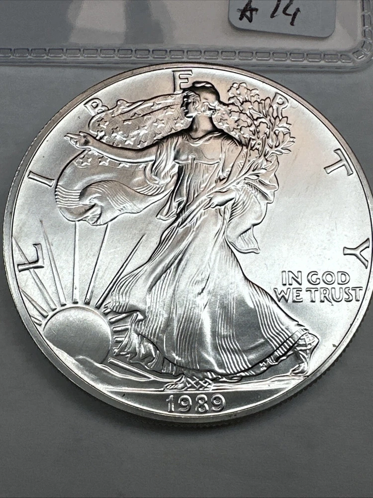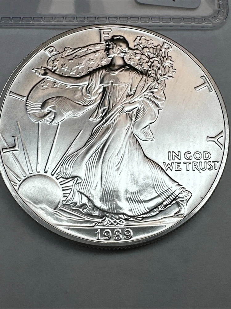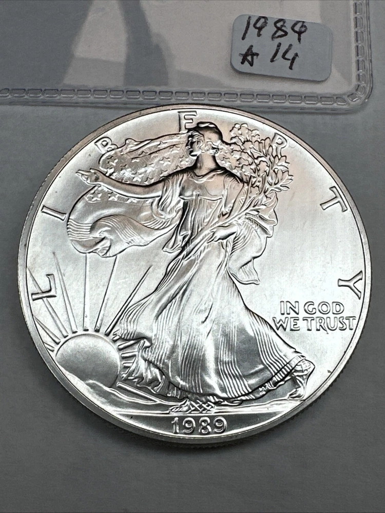 Coin: American Eagle Total Precious Metal Content: 1oz Year: 1989 Brand/Mint: U.S. Mint Brand: Silver Eagle Strike Type: Business Precious Metal Content per Unit: 1 oz Certification: Uncertified Fineness: 0.999 Composition: Silver Country/Region of Manufacture: United States Grade: Ungraded