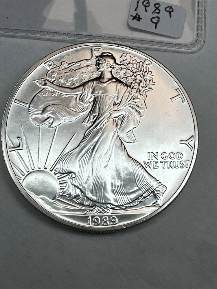 Brand: Silver Eagle Precious Metal Content per Unit: 1 oz Country/Region of Manufacture: United States Year: 1989 Composition: Silver Total Precious Metal Content: 1oz Brand/Mint: U.S. Mint Fineness: 0.999 Grade: Ungraded Coin: American Eagle Strike Type: Business Certification: Uncertified