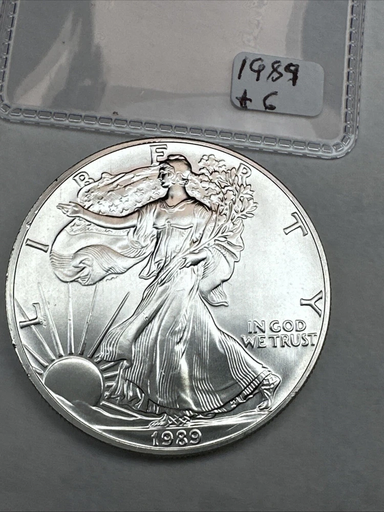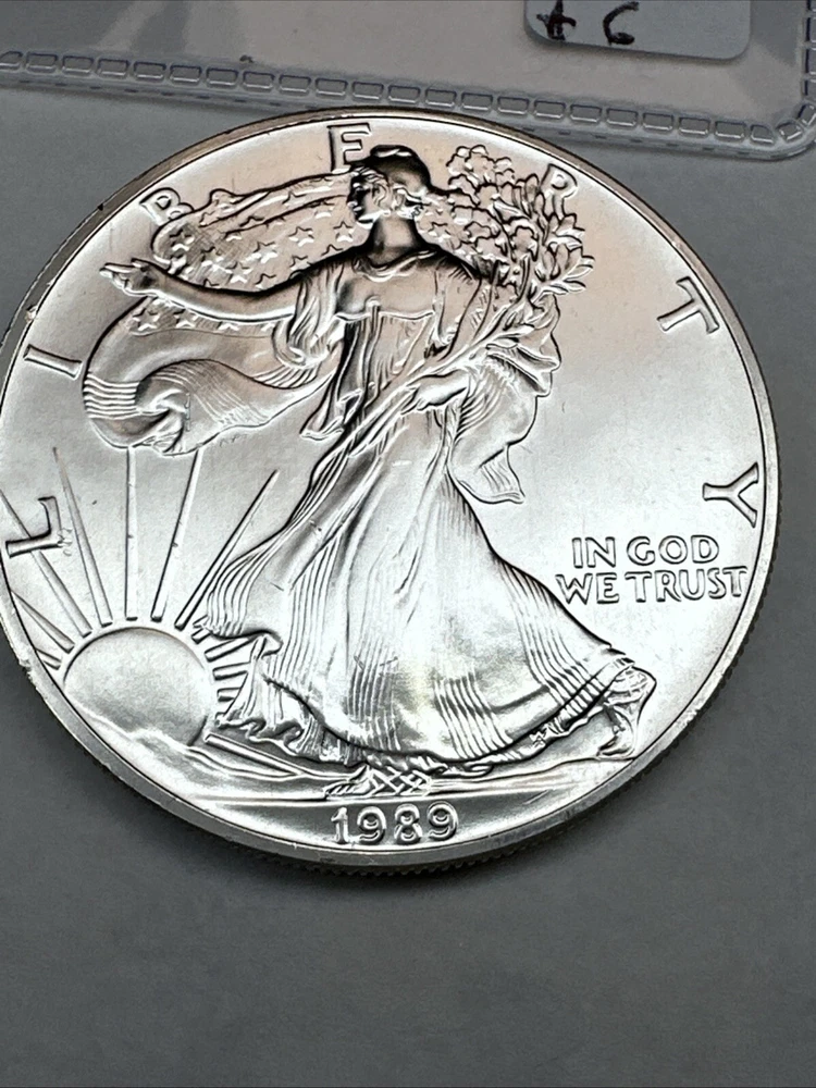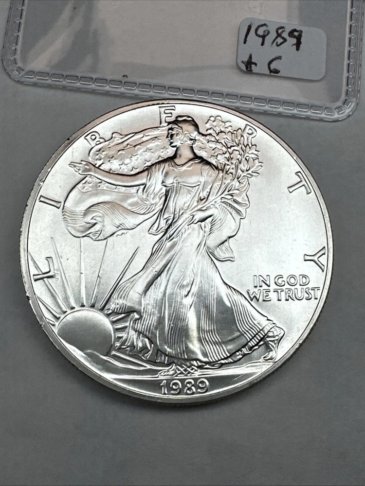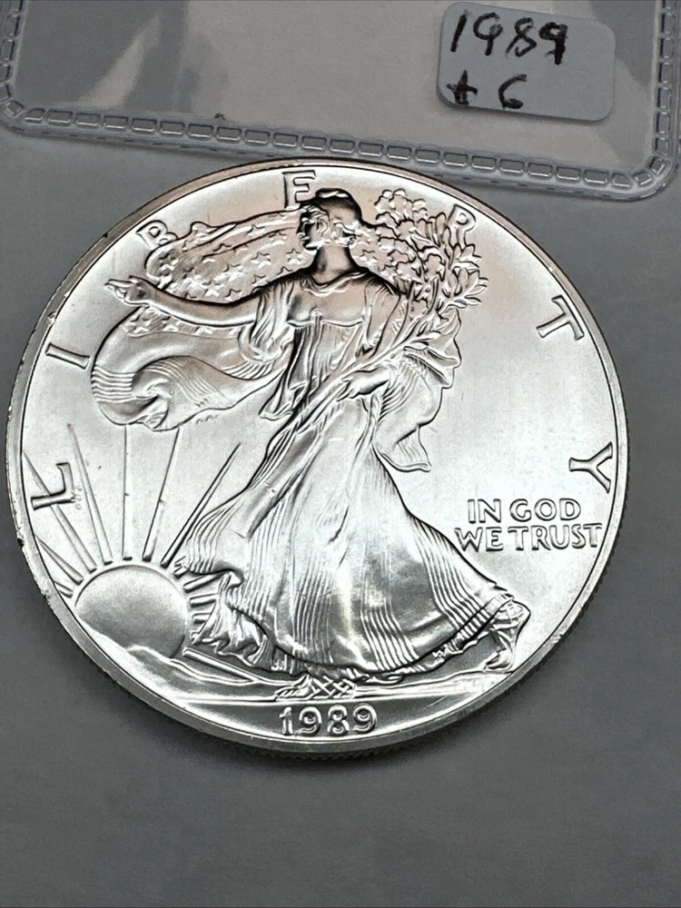 Precious Metal Content per Unit: 1 oz Year: 1989 Brand: Silver Eagle Strike Type: Business Composition: Silver Brand/Mint: U.S. Mint Total Precious Metal Content: 1oz Certification: Uncertified Grade: Ungraded Coin: American Eagle Country/Region of Manufacture: United States Fineness: 0.999