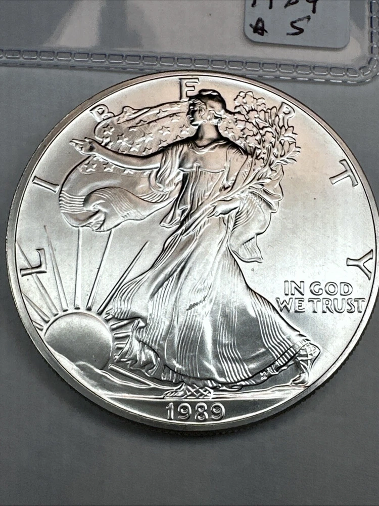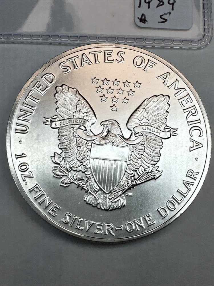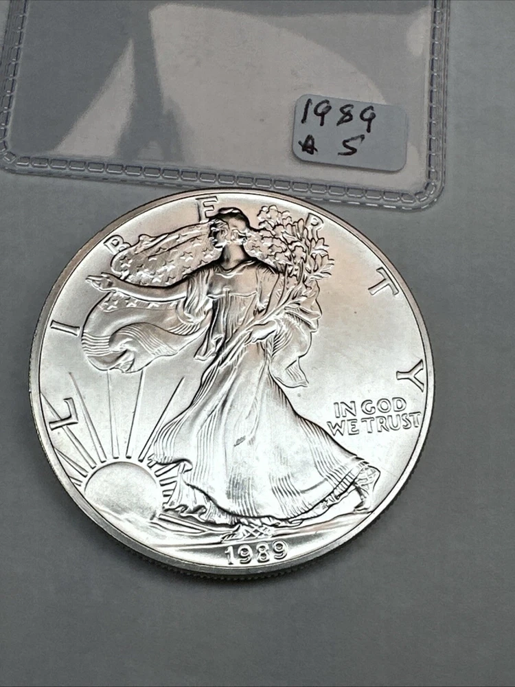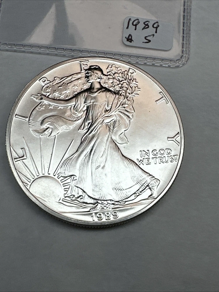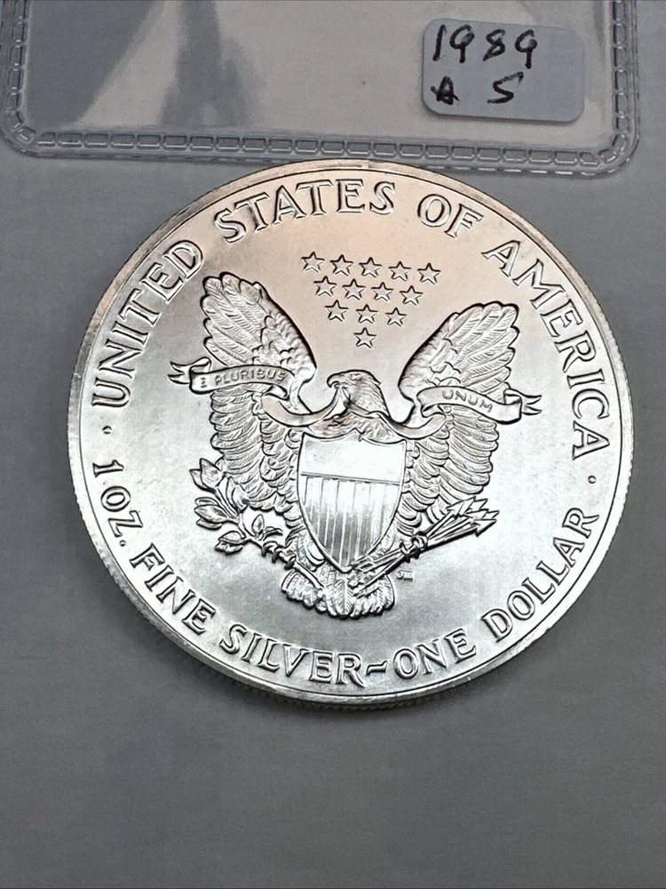 Coin: American Eagle Total Precious Metal Content: 1oz Country/Region of Manufacture: United States Brand: Silver Eagle Brand/Mint: U.S. Mint Fineness: 0.999 Year: 1989 Certification: Uncertified Precious Metal Content per Unit: 1 oz Grade: Ungraded Composition: Silver Strike Type: Business